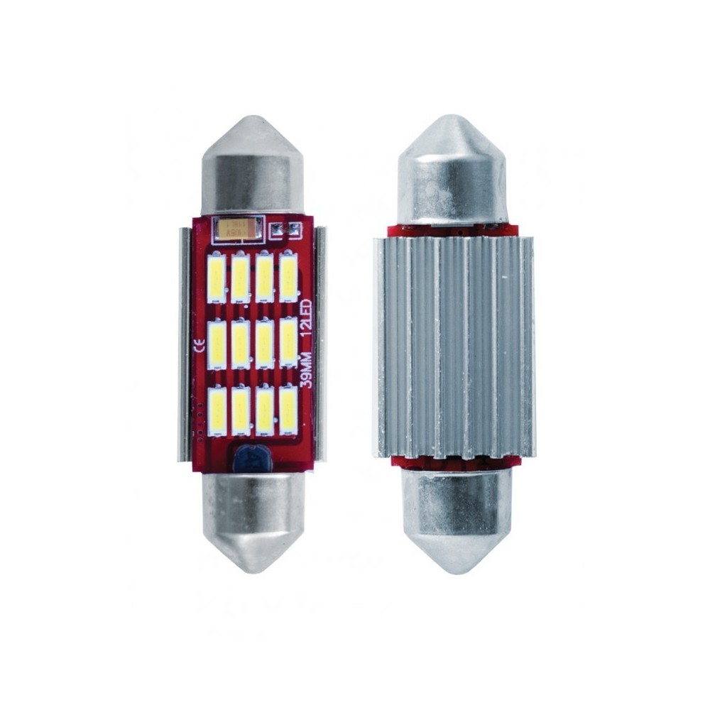 Kit 2 lampadine siluro a 12 microled alta brillantezza con resistenza da 3 watt integrata, dissipatore di calore e no polarity. Lunghezza 41mm. Led bianco. ATTENZIONE: Sebbene dotate di una resistenza interna (Canbus) risultando cosi' compatibile con la grande maggioranza delle auto, su alcuni modelli potrebbero comunque accendersi spie sul cruscotto. In tal caso consigliamo di aggiungere un'ulteriore resistenza per spegnere la spia eludendo il computer di bordo.