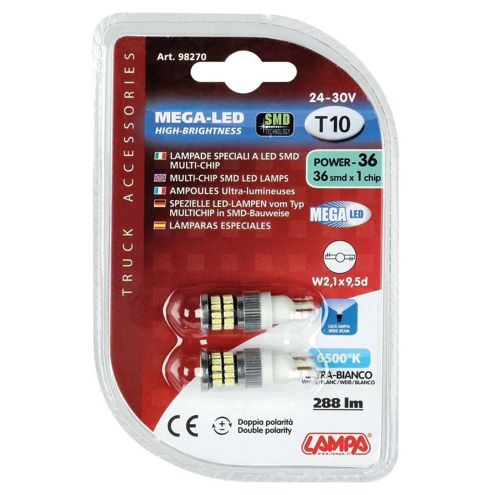 2 lampadine 36 led SMD x 1 chip 24/30 volt. 220 lumen. Lampada: (W2,1x9,5d) Attacco:T10 Luminosita': 6500K Doppia polarita'. Per le dimensioni specifiche vedi foto.