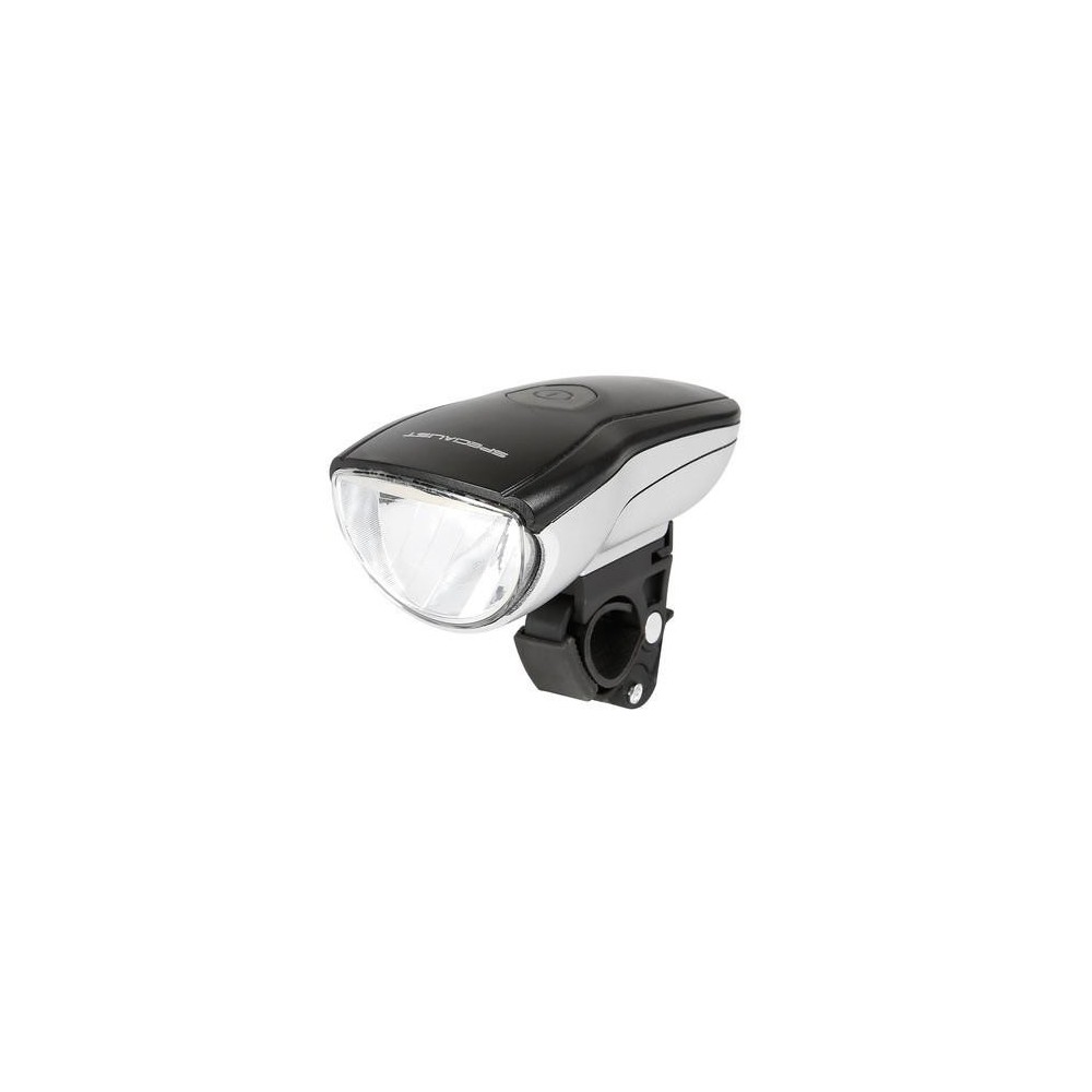Fanale anteriore con led Cree 3W. Altissima intensita' luminosa e basso consumo. 3 funzioni: luce fissa alta, fissa bassa, lampeggiante. Indicatore di carica della batteria. Staffa di fissaggio al manubrio con sistema antifurto di disinnesto rapido. Universale, di facile installazione. Funziona con 4 pile AA (non fornite).