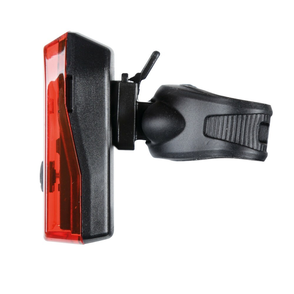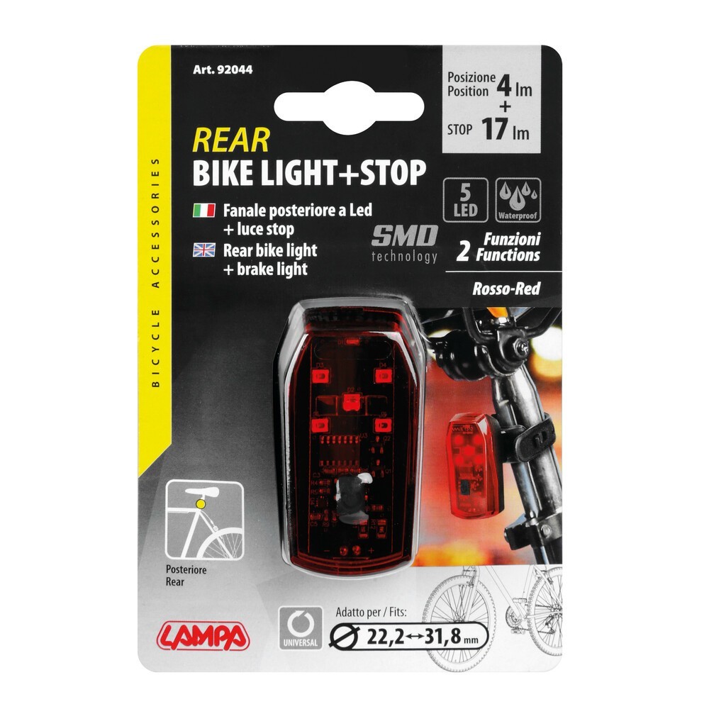 Luce di posizione (4 lm) e luce stop (17 lm). Accelerometro integrato che attiva la luce stop a 5 led per 2 secondi quando la bicicletta decelera. Funzionamento con 2 batterie AAA non fornite. Indicatore di batteria scarica. Resistente alla pioggia. Compatibile per montaggio su tubi Ø 22,2-31,8mm. Dimensione: 31x60x25mm