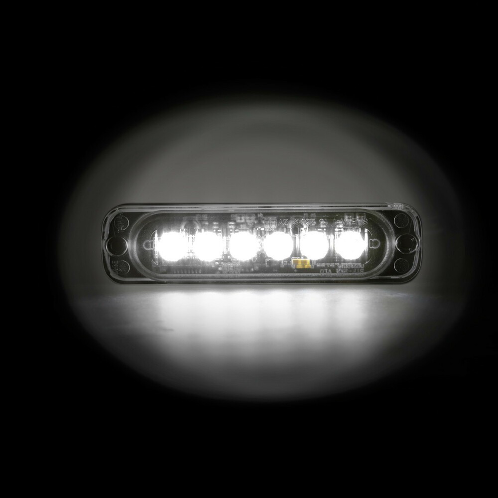 Luce strobo multifunzione a 6 Led, 12/24V. Per veicoli industriali, mezzi agricoli, di emergenza, di soccorso... Sincronizzabile con una o piu' luci dello stesso modello. Corpo in alluminio. Ultra sottile: 10 mm. Guarnizione e viti di fissaggio incluse. Impermeabile IP67.