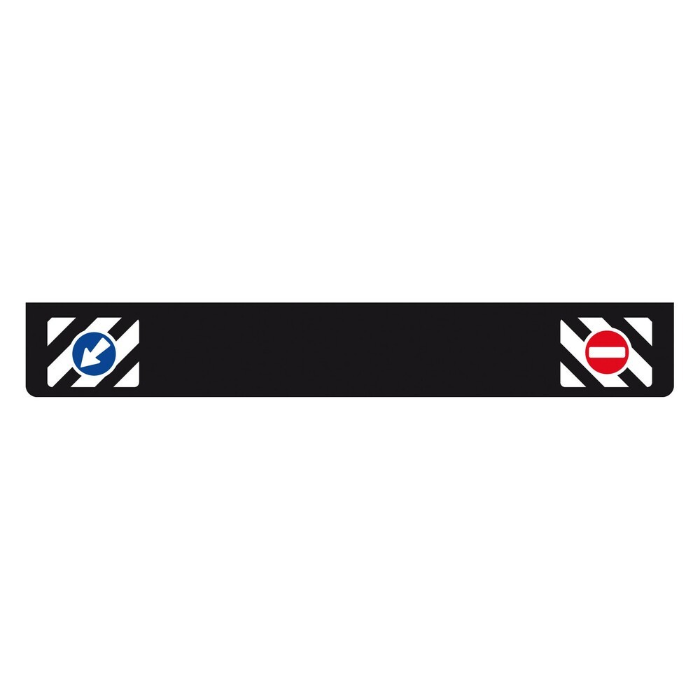 Paraspruzzi lungo in pvc unico pezzo con segnaletica. Spessore 5 mm. Doppio strato con maglia interna di rinforzo. Staffe in acciaio zincato e viti di fissaggio incluse