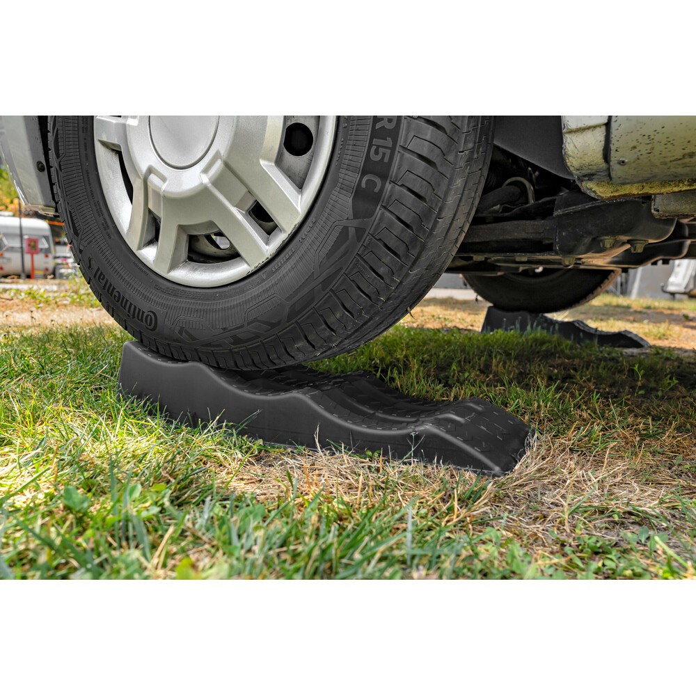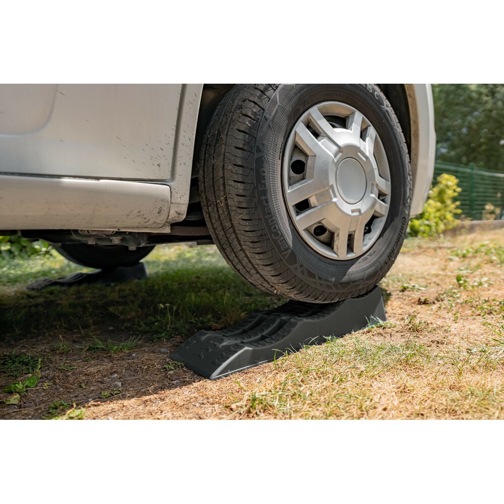Adatti per roulotte, camper, caravan e auto, supportano fino a 3,5 ton. Ampia gamma di altezze (40-70-100 mm) per adattarsi a diverse condizioni di terreno, garantendo un parcheggio stabile e livellato per il tuo veicolo. Ampia superficie di appoggio che evita lo sprofondamento, superficie antiscivolo. Plastica leggera di alta qualità con protezione UV. Pratica borsa per il trasporto e per riporre i cunei quando non vengono usati. Semplici da usare; basta posizionarli davanti alle ruote (anteriori o posteriori) e salire sulla rampa di livellamento fino all'altezza desiderata. Dimensione: 603x210x118 mm