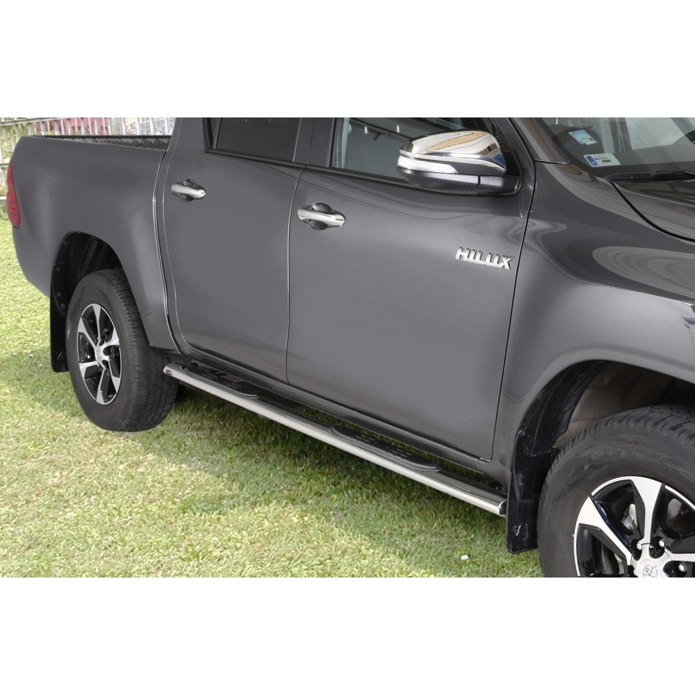 Compatibilita': Toyota Hilux Revo (doppia cabina) dal 2016>. Realizzate in acciaio inox e lucidate a specchio, sezione ovale. Oltre a facilitare l'accesso all'abitacolo per la loro posizione e per gli inserti in gomma antiscivolo rendono il look della tua vettura unico e accattivante. Fornite di staffe specifiche e kit di montaggio.