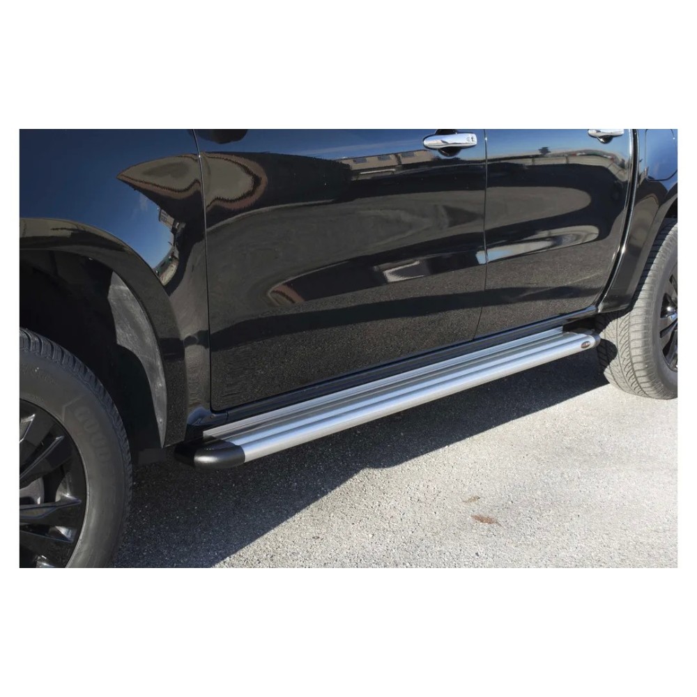 Compatibilita': Volkswagen Amarok immatricolata dal 2023. Coppia pedane laterali in alluminio. Versione: S50 stondate. DISPONIBILI anche con finali in plastica di colore bianco