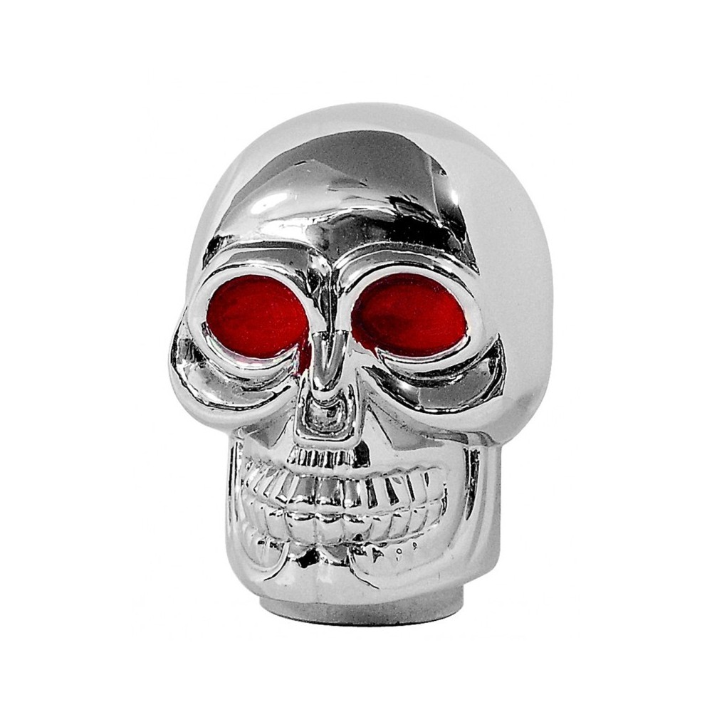 SKE/X Pomello cambio universale Simoni Racing a forma di teschio cromato con occhi rossi. Dimensioni: altezza 62mm, larghezza 43mm, profondita' 53mm