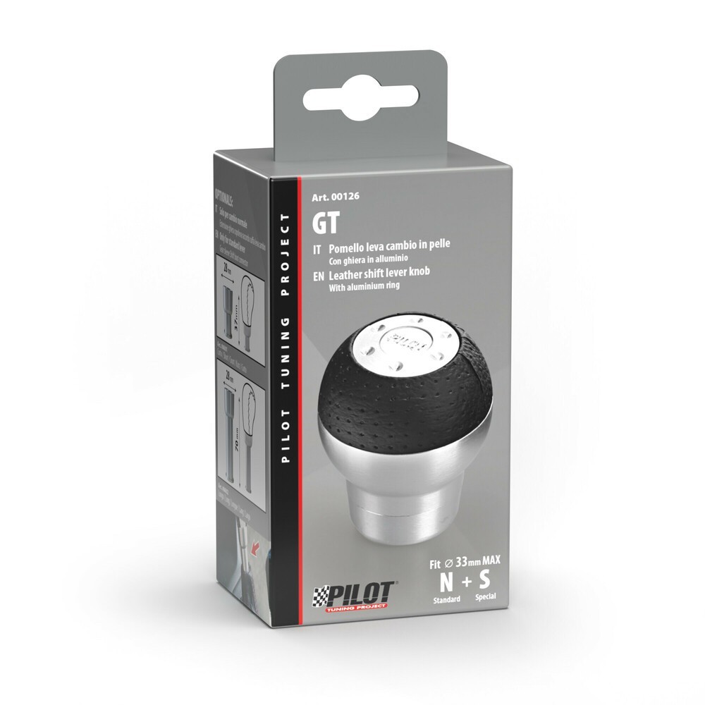 Pomello leva cambio in lega di alluminio e pelle colore nero. Idoneo per: leva cambio standard fino a 15mm di diametro e leva cambio speciale ( ghiera innesto retromarcia ad asta o siringa ) fino a 33 mm massimo di diametro