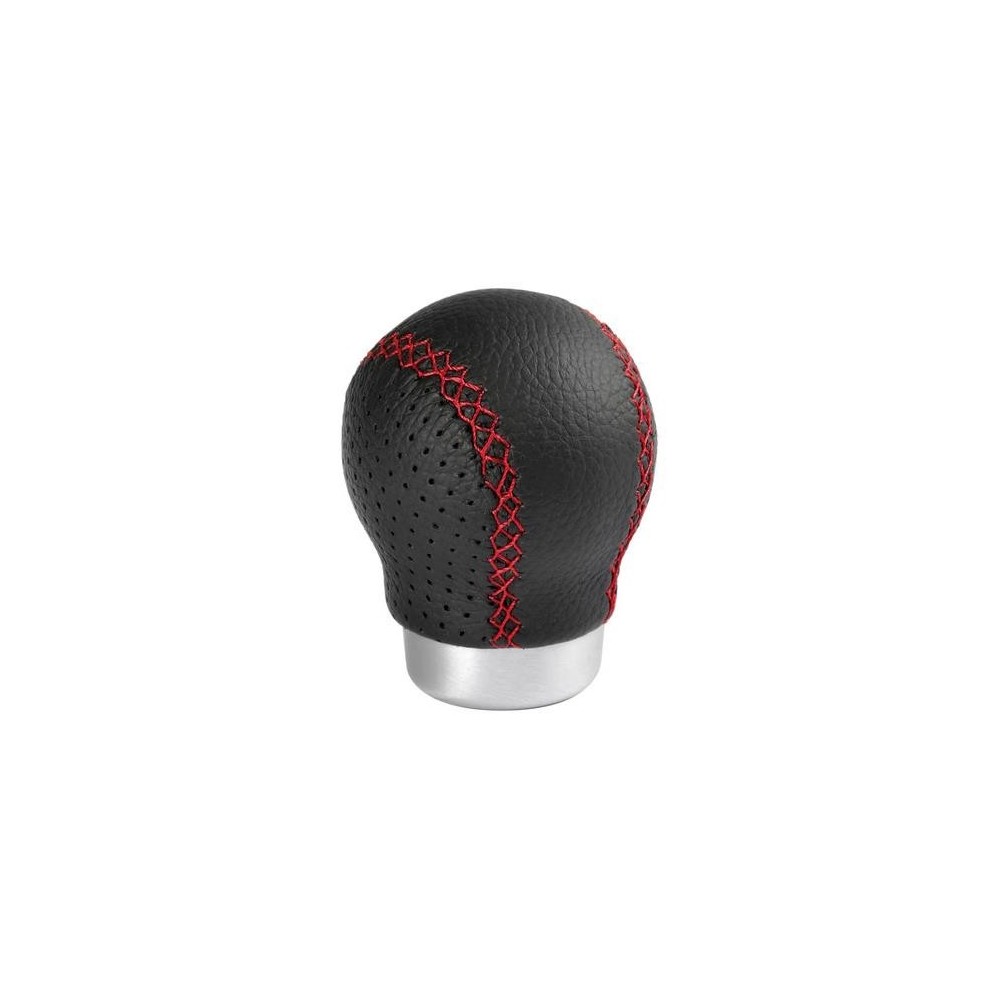 Pomello cambio in pelle nera con cuciture rosse e alluminio spazzolato. Montaggio fai da te tramite kit con adattatori e chiave esagonale in dotazione. Attacco brevettato universale idoneo per leve cambio standard (diametro 15 mm max) e leve cambio speciali con ghiera di innesto retromarcia a siringa (diametro 30 mm max)