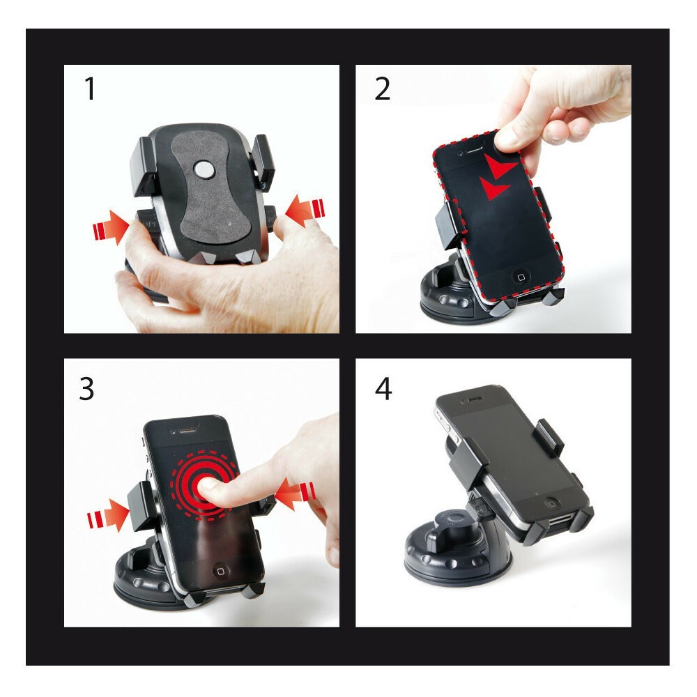 Easy-Lock, portatelefono con bloccaggio automatico. Bloccaggio del telefono in automatico quando lo si posiziona sul porta telefono. Montaggio facile e veloce. Snodo regolabile a proprio piacimento. Ventosa con base adesiva per una presa ancora piu' sicura su parabrezza e cruscotto, anche con superficie non liscia. La base adesiva puo' essere lavata con acqua. Non macchia e non lascia residui. Per telefoni max 75 mm