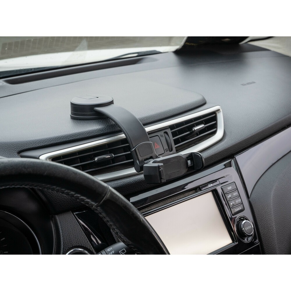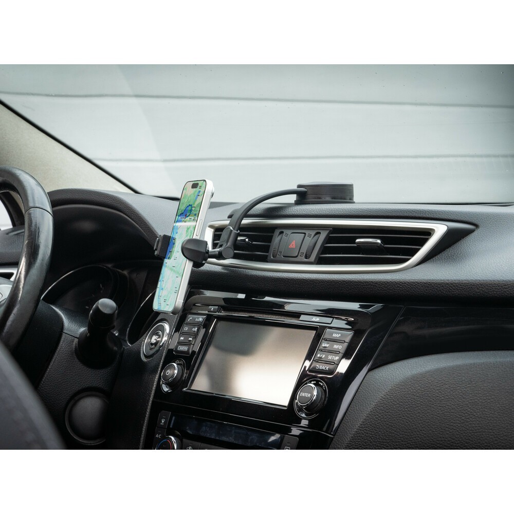 Ideale per un fissaggio discreto senza ostruire la visuale durante la guida. La clip a scatto consente un inserimento rapido e semplice del telefono. La ventosa adesiva garantisce una perfetta aderenza su cruscotti e parabrezza. Il collo flessibile da 13 cm si adatta alla forma del cruscotto o del parabrezza, mentre il supporto orientabile permette di trovare il miglior angolo visivo per lo smartphone. La base con ventosa è orientabile senza necessità di rimuoverla dalla superficie di applicazione. Per telefoni con larghezza da 60 a 87 mm