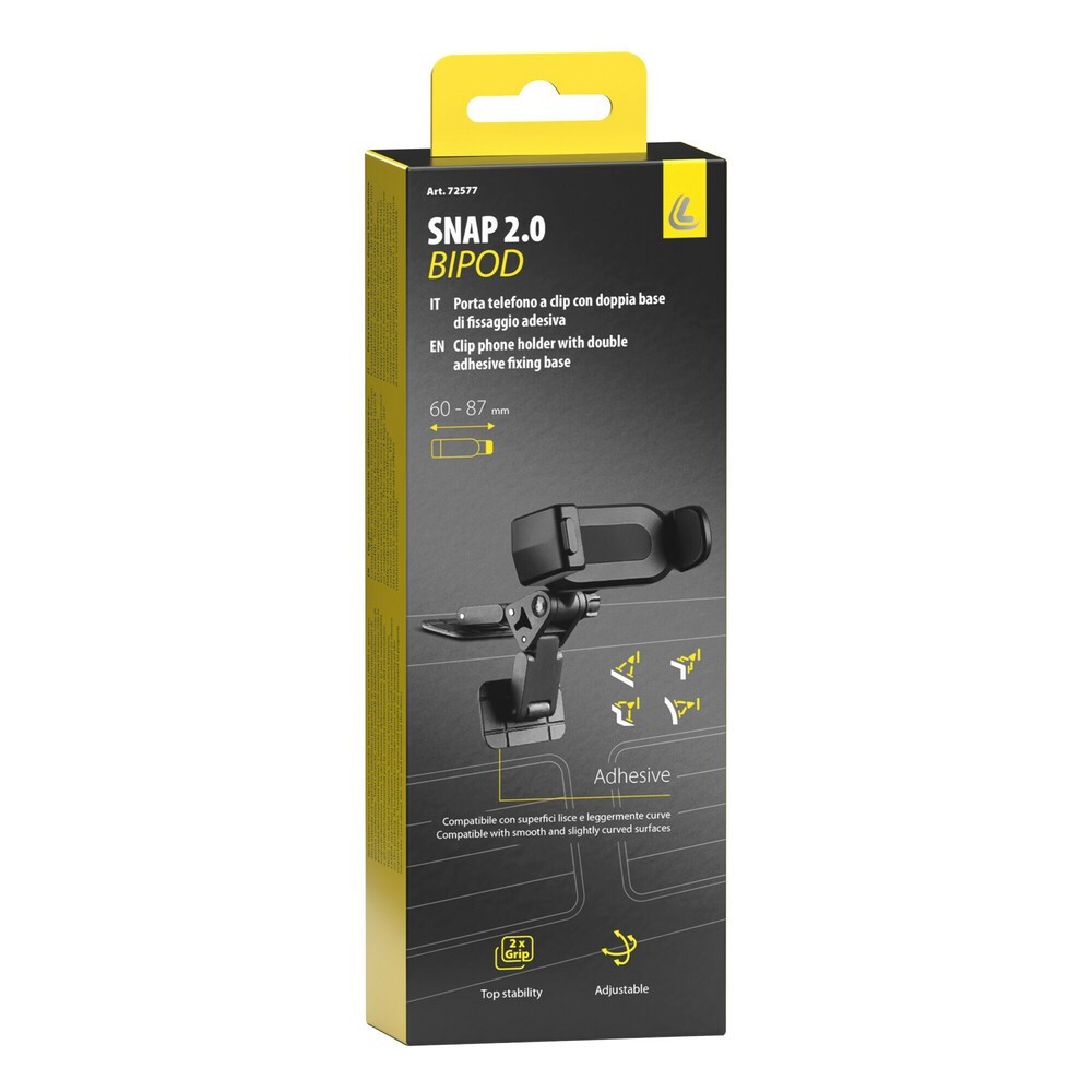 Compatibile con dispositivi da 60 a 87 mm di larghezza. Apertura a scatto per inserimento facile e veloce del telefono. Doppia base adesiva che garantisce una tenuta extra forte anche su superfici liscie curve o angolari. Le gambe del supporto sono completamente regolabili e gli adesivi si adattano a superfici irregolari. La struttura è orientabile e offre massima versatilità.