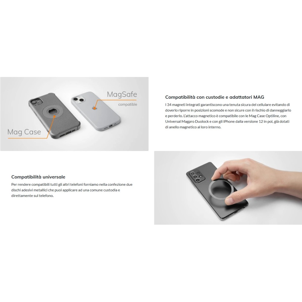I 34 magneti integrati garantiscono una tenuta sicura del cellulare evitando di doverlo riporre in posizioni scomode e non sicure con il rischio di danneggiarlo e perderlo. L'attacco magnetico è compatibile con le Mag Case Optiline, con Universal Magpro Duolock e con gli iPhone dalla versione 12 in poi, già dotati di anello magnetico al loro interno.