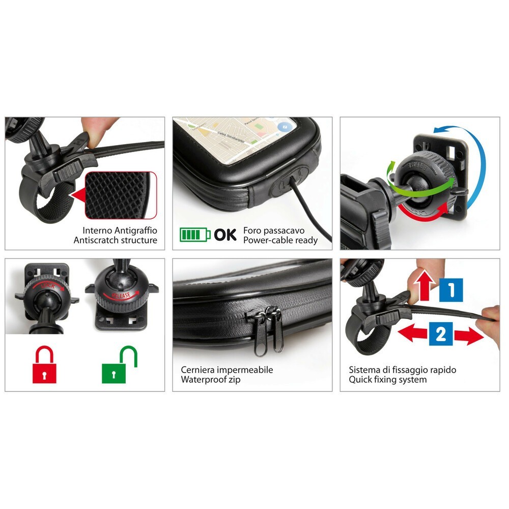 Quick fix holder, portatelefono con fissaggio rapido. Impermeabile, indicato per smartphones, navigatori, telefoni...Frontale trasparente che consente l'utilizzo del touch screen. Chiusura a cerniera e foro passacavo per l'alimentazione elettrica. Braccio orientabile con sistema di fissaggio rapido universale. Misure: 175x105xH35mm. Per manubri diametro minimo 20mm e massimo 48mm. Per dispositivi con misure max. 160x90mm.