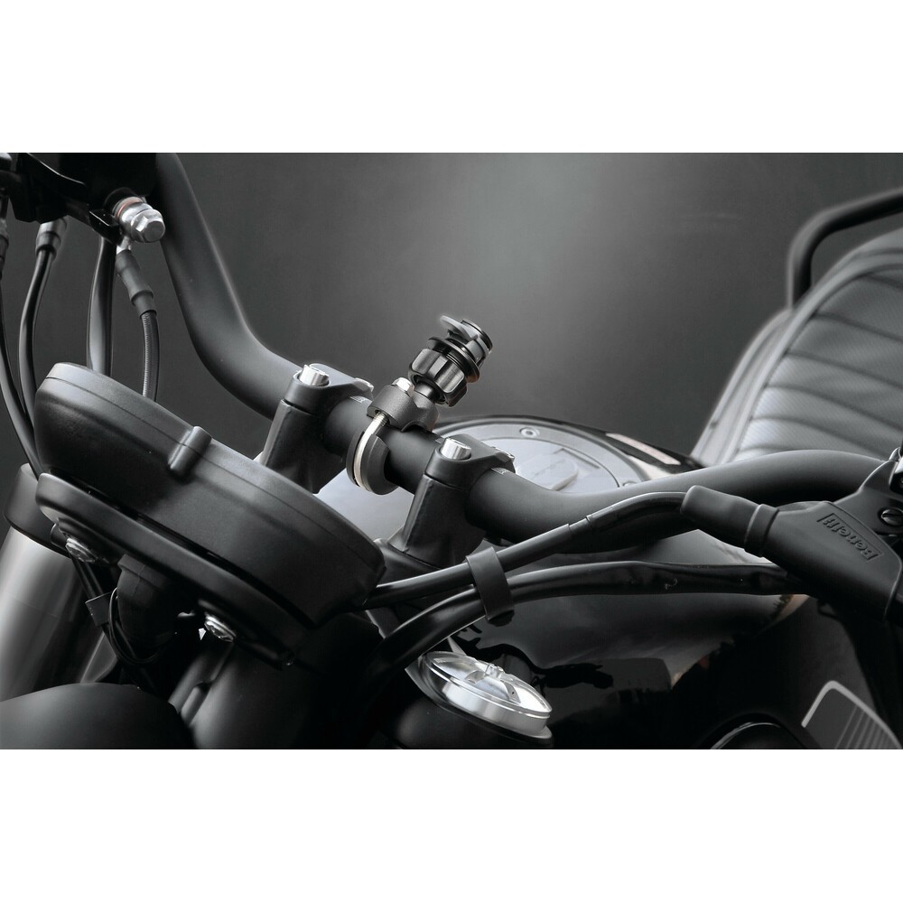 Attacco per manubrio ad alta resistenza con struttura in metallo presso fuso, sfera gommata per ridurre urti e vibrazioni, sistema di fissaggio orientabile per trovare il miglior angolo di visione. Sistema di aggancio/sgancio rapido DuoLock. Compatibile con tutte le custodie Opti Line. idoneo per manubri di diametro da 22 a 28 mm.