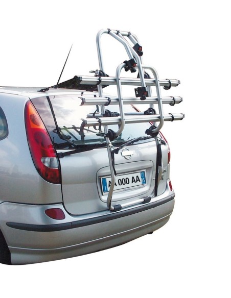 Portabici posteriore per il trasporto di 3 biciclette per Monovolume e Station Wagon con portellone piu grande. Regolabile in altezza per evitare la copertura della targa. Realizzato in alluminio elettrosaldato garantisce una garanzia di assoluta sicurezza anche in situazioni estreme. 6 snodi dentellati con doppio raggio per una perfetta tenuta anche su dossi stradali e strade sterrate. Telaio a "U" e "Appoggi Stretti" in pura gomma appositamente realizzati per un appoggio sicuro anche su paraurti poco sporgenti. 6 fibbie e 6 cinghie con ganci plastificati di alta qualita' antigraffio. 6 cinghietti e fibbie robuste spessorati in gomma antigraffio per fissaggio ruote bici. Braccini fermabici inclusi per un montaggio facile e sicuro delle biciclette. Richiudibile quando viaggia senza bici con un ingombro minimo e maggiore sicurezza.
