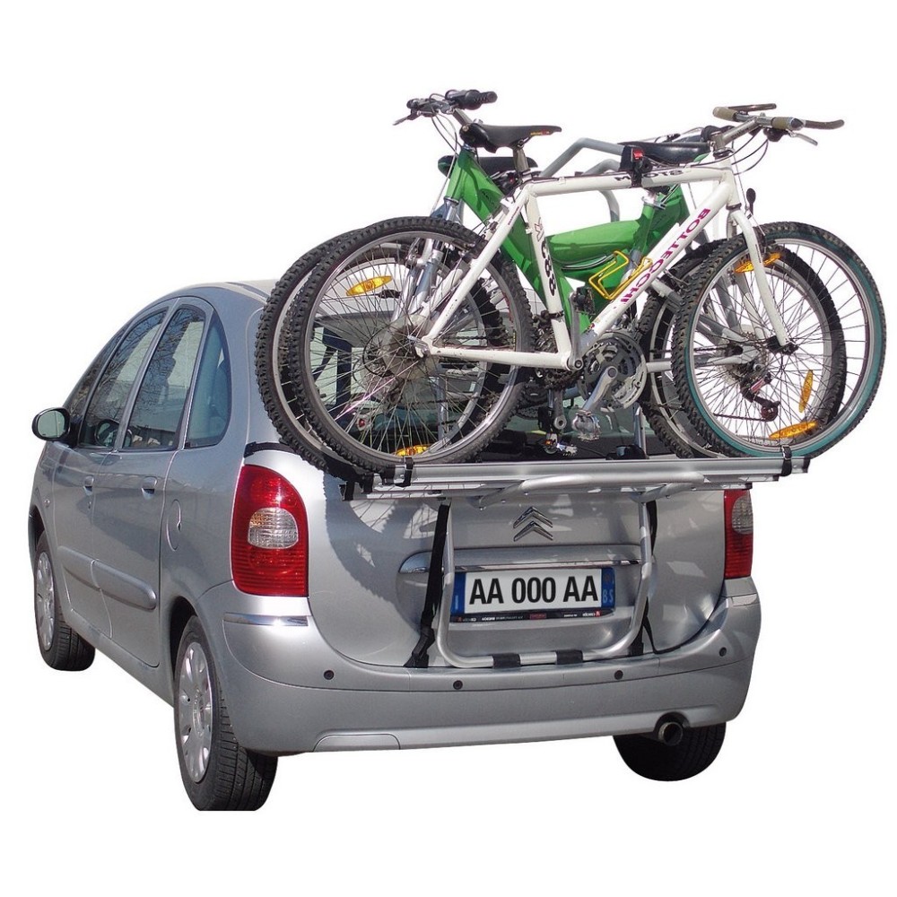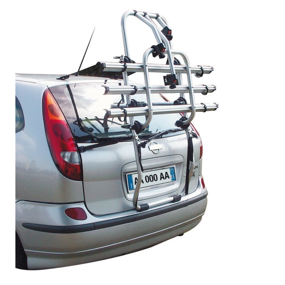 Portabici posteriore per il trasporto di 3 biciclette per Monovolume e Station Wagon con portellone piu grande. Regolabile in altezza per evitare la copertura della targa. Realizzato in alluminio elettrosaldato garantisce una garanzia di assoluta sicurezza anche in situazioni estreme. 6 snodi dentellati con doppio raggio per una perfetta tenuta anche su dossi stradali e strade sterrate. Telaio a "U" e "Appoggi Stretti" in pura gomma appositamente realizzati per un appoggio sicuro anche su paraurti poco sporgenti. 6 fibbie e 6 cinghie con ganci plastificati di alta qualita' antigraffio. 6 cinghietti e fibbie robuste spessorati in gomma antigraffio per fissaggio ruote bici. Braccini fermabici inclusi per un montaggio facile e sicuro delle biciclette. Richiudibile quando viaggia senza bici con un ingombro minimo e maggiore sicurezza.