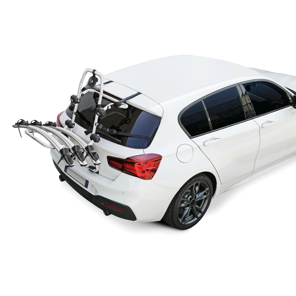 Montaggio facile e veloce, senza fori ed utensili, tubo tondo in alluminio anodizzato di diametro 30 mm, Tamponi di appoggio in morbida gomma antiscivolo e canaline di supporto in alluminio anodizzato con alloggiamenti ruota scorrevoli muniti di cinghietti fissaggio rapidi. Telaio regolabile mediante robusti snodi ad innesto frontale per una perfetta adattabilita' ad una vasta gamma di vetture. 6 cinghie a doppio effetto per aumentare la tenuta e la forza di fissaggio, cinghie laterali munite di ammortizzatori anti distacco. Ripiegabile per diminuire l'ingombro quando non ci sono biciclette caricate. Omologazione: GS-TUV max 45kg