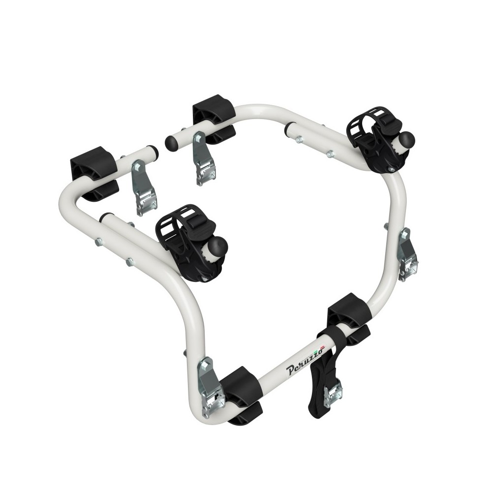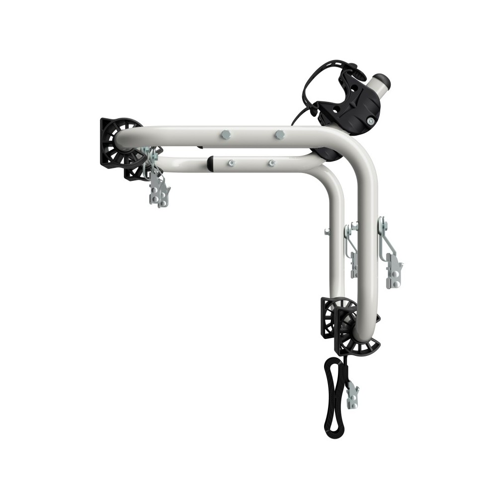 La soluzione ideale per il ciclista ''single''. Attacco rigido superiore: 2 cinghie a tenuta extra (testati per uno sforzo di 250 Kg ciascuna), 4 ganci temprati (testati per uno sforzo di 350 Kg ciascuno), fibbie in acciaio. Sistema antidistacco per le cinghie inferiori. Sistema bloccabici brevettato dotato di protezione telai con effetto ammortizzatore. Cinghia di sicurezza cucita direttamente sul portabici. Estremamente pratico. Colore: bianco. Carico max 17kg. Montaggio bici a telaio. Sezione max telaio bici: diametro 60mm. Dimensione max bici: 29 pollici. Senza fissaggio con chiave bici-portabici