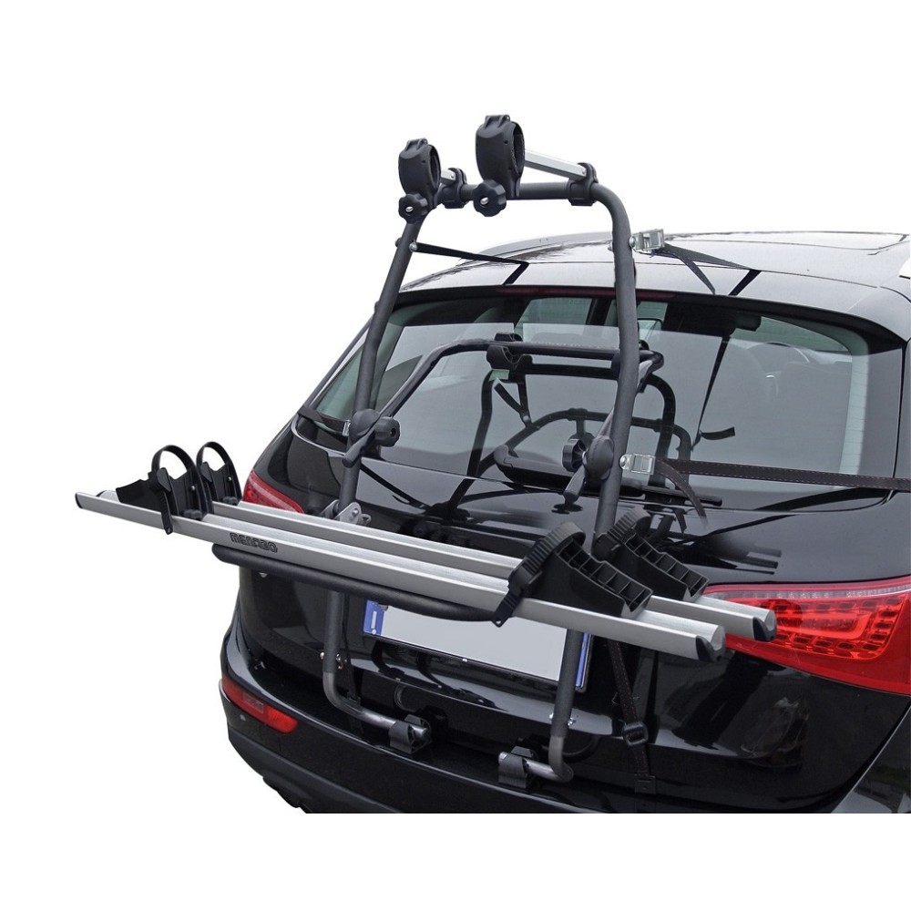 Portabici posteriore con struttura in acciaio e corsie in alluminio. Richiudibile e semplice da montare sul retro dell'auto. Adatto a 2 bici (no Fat-bike)con portata max di 30 kg ( 1 e-bike max 25kg )