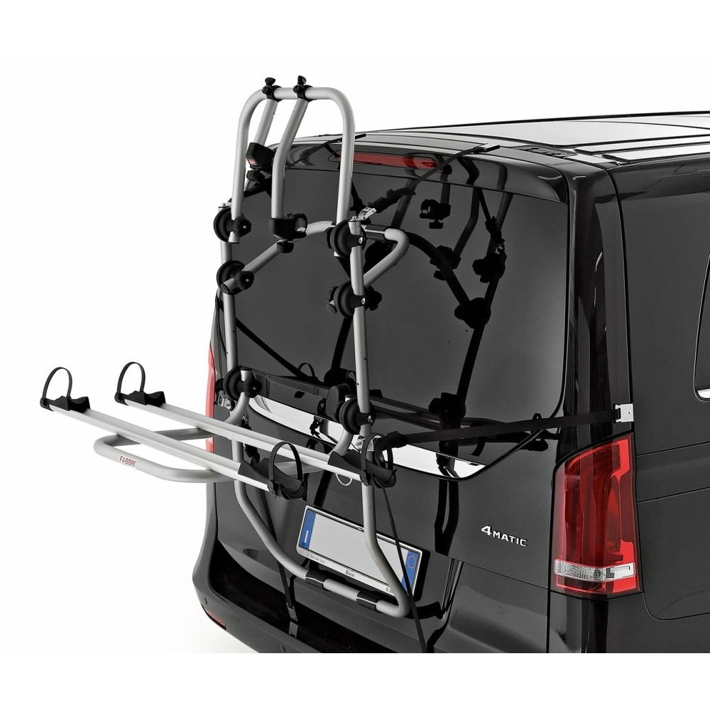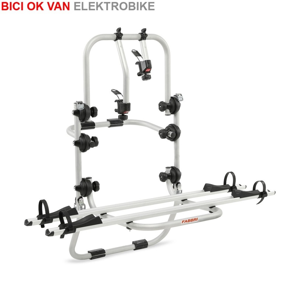 Portabici in alluminio elettrosaldato richiudibile con telaio specifico per van. appoggi in gomma morbida antigraffio, progettato per il trasporto fino a 2 biciclette elettriche (da 20'' a 29''/700c). Canaline regolabili in altezza in alluminio lunghezza 125 cm per bici con passo fino a 117 cm e gomme fino a 2,6''/6,5 cm. Montaggio delle biciclette mediante bracci in alluminio rotanti di 360 gradi. Con sistema ''Viti Block'' per la protezione dell'alluminio nel serraggio delle viti. 6 cinghie e 6 fibbie con ganci plastificati di alta qualità antigraffio (testate per 250 kg) con adattatore per carrozzerie speciali. Non copre la targa, non è quindi necessario l'acquisto di una targa ripetitrice. Portata massima 45Kg (22,5Kg per canalina). Made in Italy