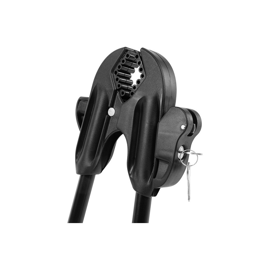 Portabici con antifurto montabile su tutte le barre portatutto con sezione max. fino a 75x40 mm e per la maggior parte delle barre in alluminio con canalina. Adattabile a tutti i tipi di bici con telai da diametro 30 a 75 mm. Con canaline per trasporto di ruote MTB aventi sezione maggiorata, correlata di passaruote in materiale termoplastico e cinghietto di facile utilizzo.