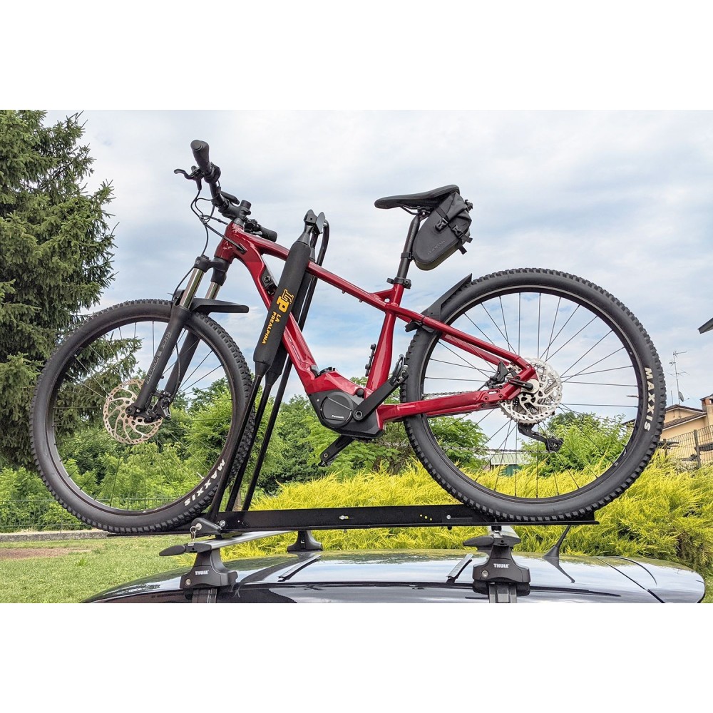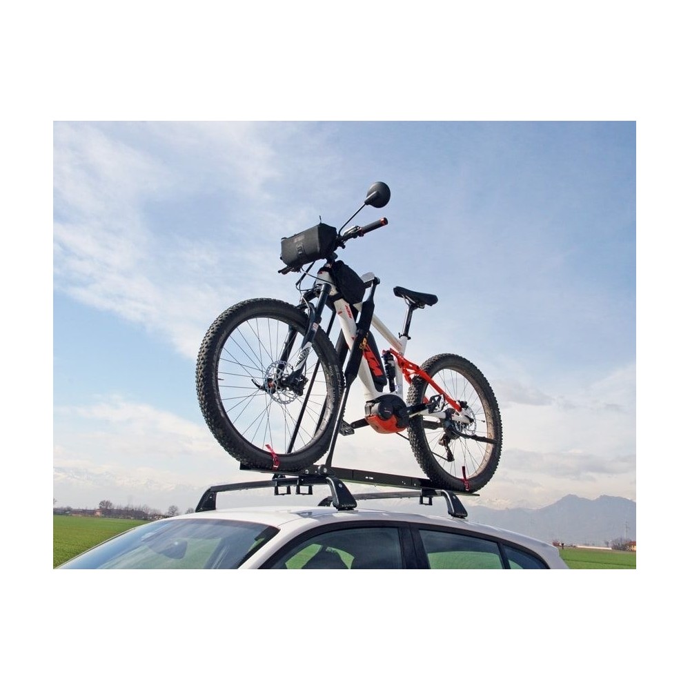 Kit portabici preassemblato da applicare a barre portatutto. Canalina piatta in acciaio verniciato con polveri termoindurenti ''long life'' anticorrosione che facilita il caricamento e il posizionamento delle bici elettriche e delle fat-bike con gomme piu' grandi. Bracci blocca-bici in profilato d'acciaio verniciato, con riparo in ''polar'' per non rovinare il telaio, adattabile a tutti i telai sezione max 80 mm ( per telaio da 80mm a 100mm e' ordinabile l'adattatore cod. 14088 ). Kit di montaggio in dotazione idoneo a barre portatutto con sez max. 59x30mm e barre portatutto con scanalatura superiore (cava a T). Portata: 23kg