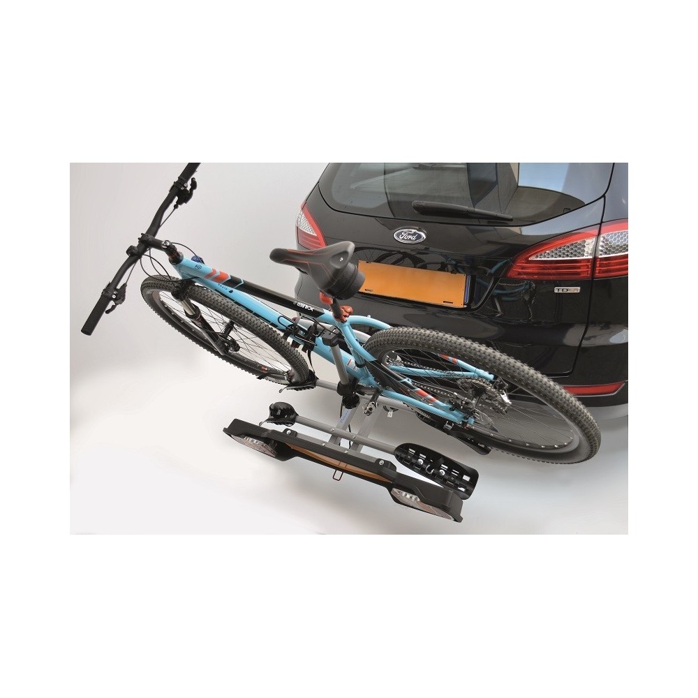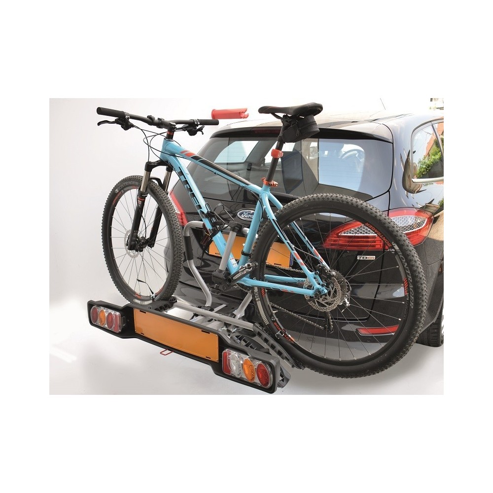 Portabici gancio traino in acciaio verniciato, modello Siena, facile da montare e smontare, completo di barra ripetitrice con fanali e spina 13 poli omologata secondo direttiva europea. Ampio poggiaruote e robusta struttura. Sistema pieghevole per apertura baule con bici caricate. Carico max. per bici: 15Kg. Larghezza max. ruote bici: 80mm. Misure di ingombro (ALT. x LARG. x PROF) 610x1090x900mm