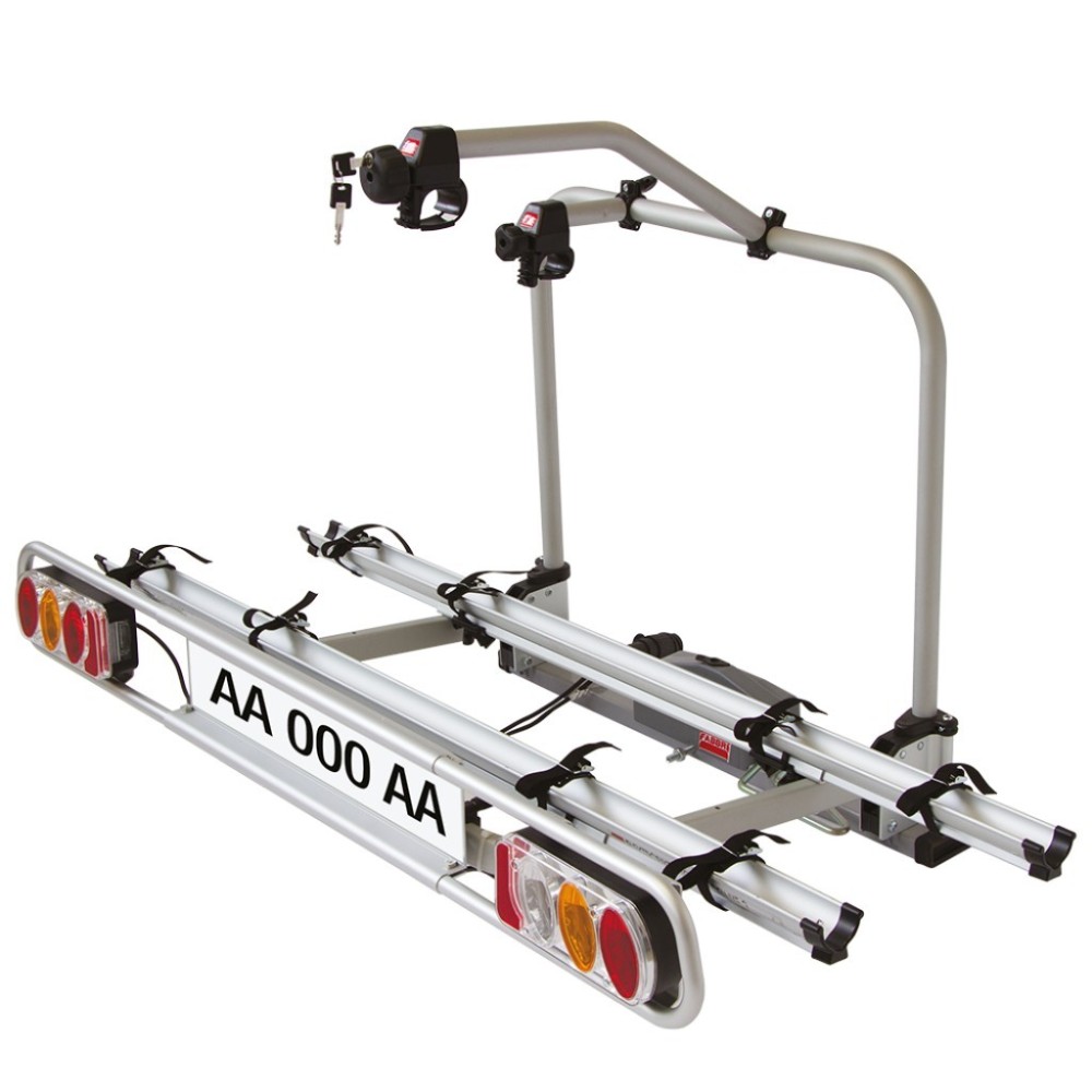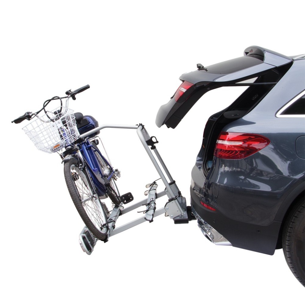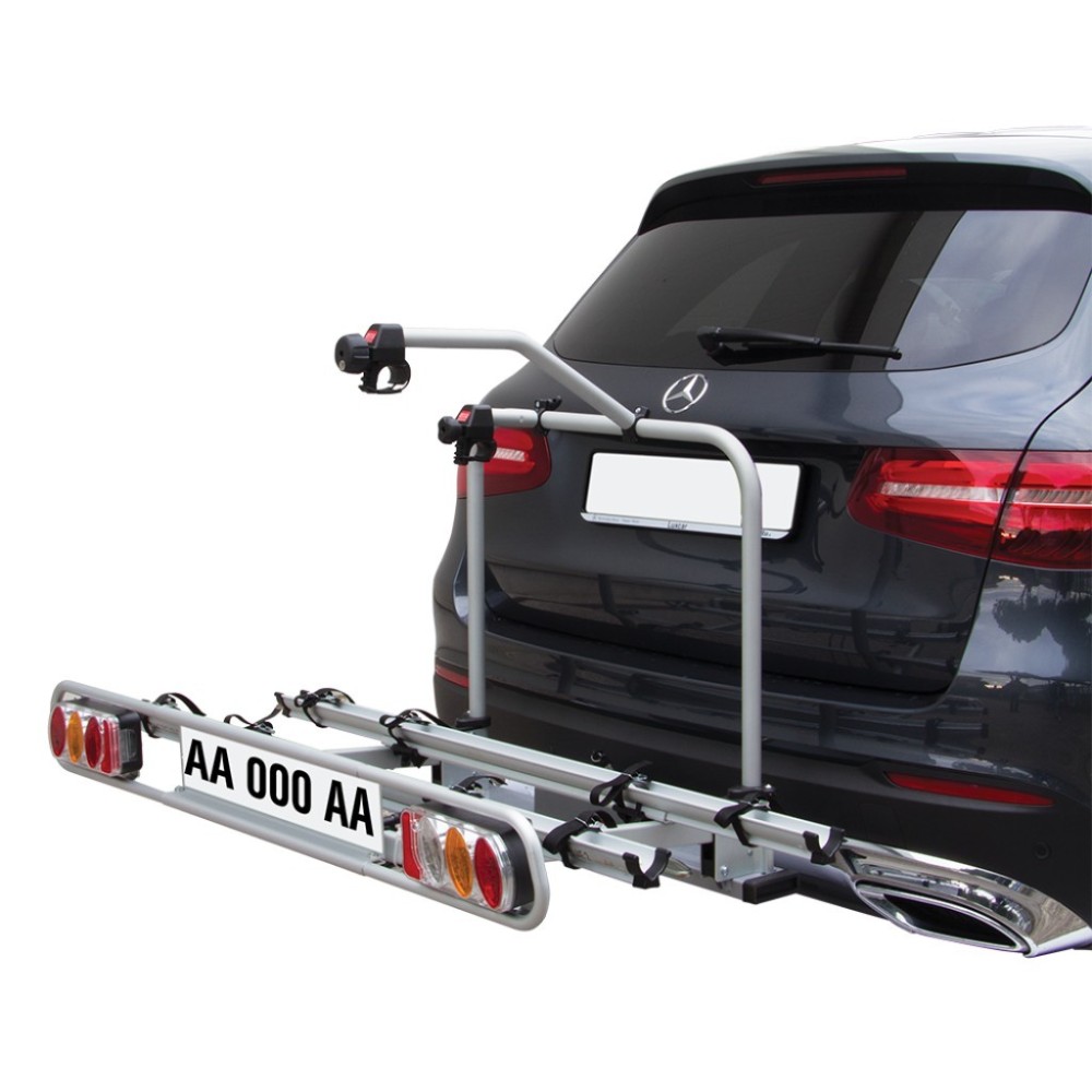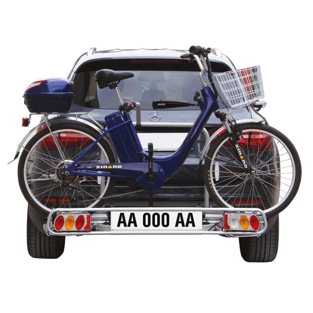 PORTABICI PER GANCIO TRAINO PER TRASPORTARE FINO A 2 BICI ELETTRICHE. Richiudibile. Ribaltabile: il bagagliaio rimane accessibile in qualsiasi momento. Trasformabile in porta sci & snowboard con l'optional Exclusiv Ski&Board ed in portabagagli con l'optional Exclusiv Minibox (cm 120x68x68 ? Lt 300) ( da ordinare separatamente ). Sistema di chiusura rapida brevettata: garantisce un facile e veloce montaggio sul gancio traino. Antifurto: sistema di chiusura antifurto con una sola chiave, la stessa chiave protegge le biciclette e il portabici sul gancio. Leggerezza e robustezza del prodotto garantite grazie all'utilizzo dell'alluminio elettrosaldato. Montaggio delle biciclette mediante bracci in alluminio rotanti di 360 gradi. Lunghezza del binario 1360 mm, per ruote con larghezza fino a 51 mm e passo fino a 1250 mm. Cavetto di fissaggio in dotazione di 320 mm per telai di diametro 30-50 mm. ''Optional Rampa'': per facilitare la salita di elettriche pesanti sul portabici ( da ordinare separatamente ). Portata massima 60 Kg. Pre assemblato. Regolazione telescopica dei fanali. Conforme alla norma ISO/ PAS 11154:2006 Paragraph 5.3.4./Direttiva CEE 79/488. Omologazione VCA.