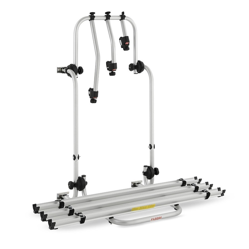 Portabiciclette posteriore in alluminio 2 o 3 posti per camper. Tubo in alluminio anodizzato colore argento diametro 30mm. Il materiale speciale denominato elettrosaldato permette l'utilizzo di spessori minori per una maggior leggerezza e rigidezza del prodotto. Appoggi a vettura in gomma antigraffio e antimacchia. Snodi in materiale termoplastico ad elevata resistenza meccanica. Bloccaggio bici tramite bracci in alluminio rotanti a 360 gradi con protezione in gomma. Altezza interasse attacchi portabici regolabile: da Min. 47 a Max. 87cm.