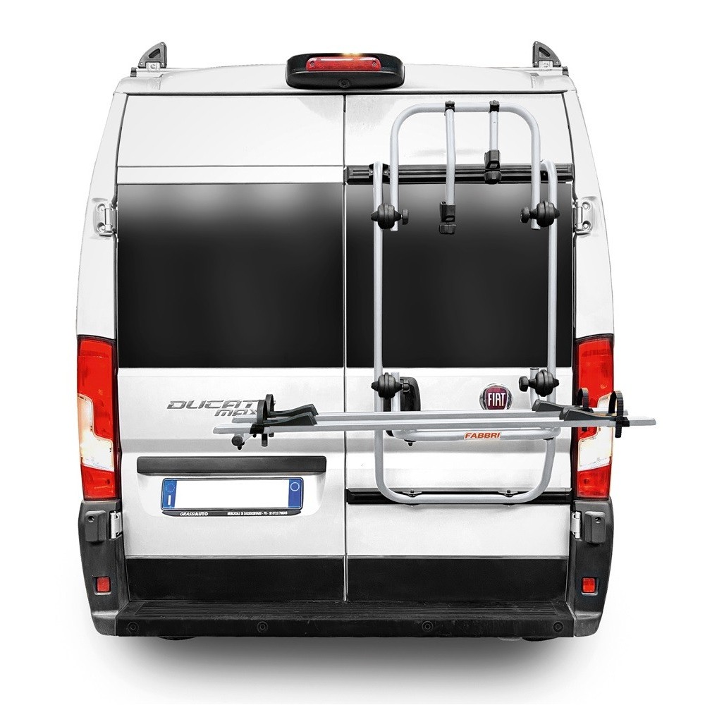 Per Fiat Ducato, Citroen Jumper e Peugeot Boxer ( dal 2007 ). COLORE SILVER. Portabici in alluminio elettrosaldato con telaio specifico per camper van con apertura a doppia porta posteriore. Fissaggio tramite staffe, silicone e biadesivo su di un'anta del van. Bloccaggio bici tramite bracci in alluminio rotanti a 360 gradi con protezione in gomma. Adattabili a tubi da 2.4 a 6.5cm. Canaline MTB in alluminio da 125cm per bici con passo fino a 117cm e gomme fino a 2.6''/6.5cm con cinghietti ferma ruote antigraffio. Canaline traslabili orizzontalmente e regolabili in altezza. Non copre la targa. Trasporta fino a 2 biciclette ( da 20'' a 29'' ), pre-assemblato e richiudibile. Portata max 45cm. Disponibili come optional: pomello antifurto bici e canaline MTB da 135cm per bici con passo fino a 127cm