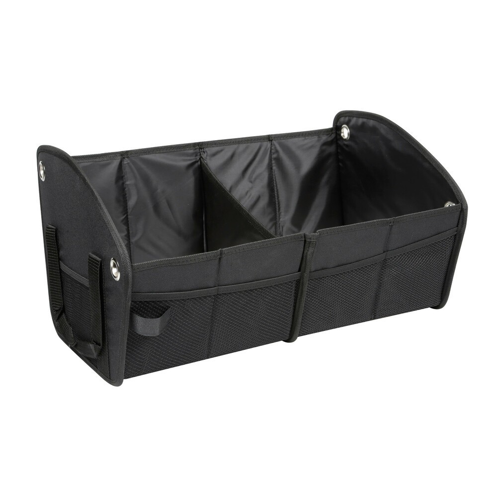 Organizer Deluxe per baule per suv, fuoristrada, monovolume, pick-up, autovetture e furgoni. Estremamente compatta quando piegata e di grande capienza quando aperta. Ideale per lo shopping giornaliero ed anche per uso professionale su veicoli da lavoro. Resistente, interamente in polyestere antistrappo 600D lavabile, con alta resistenza all'usura e alle sollecitazioni. Struttura a due compartimenti rigida e ripiegabile. 2 compartimenti, 6 tasche laterali. Base con nastri a strappo per il fissaggio al veicolo. Dimensione: L52xH28xP32cm (disponibile anche in taglia L 55x26x38cm e XL 70x30x36cm)