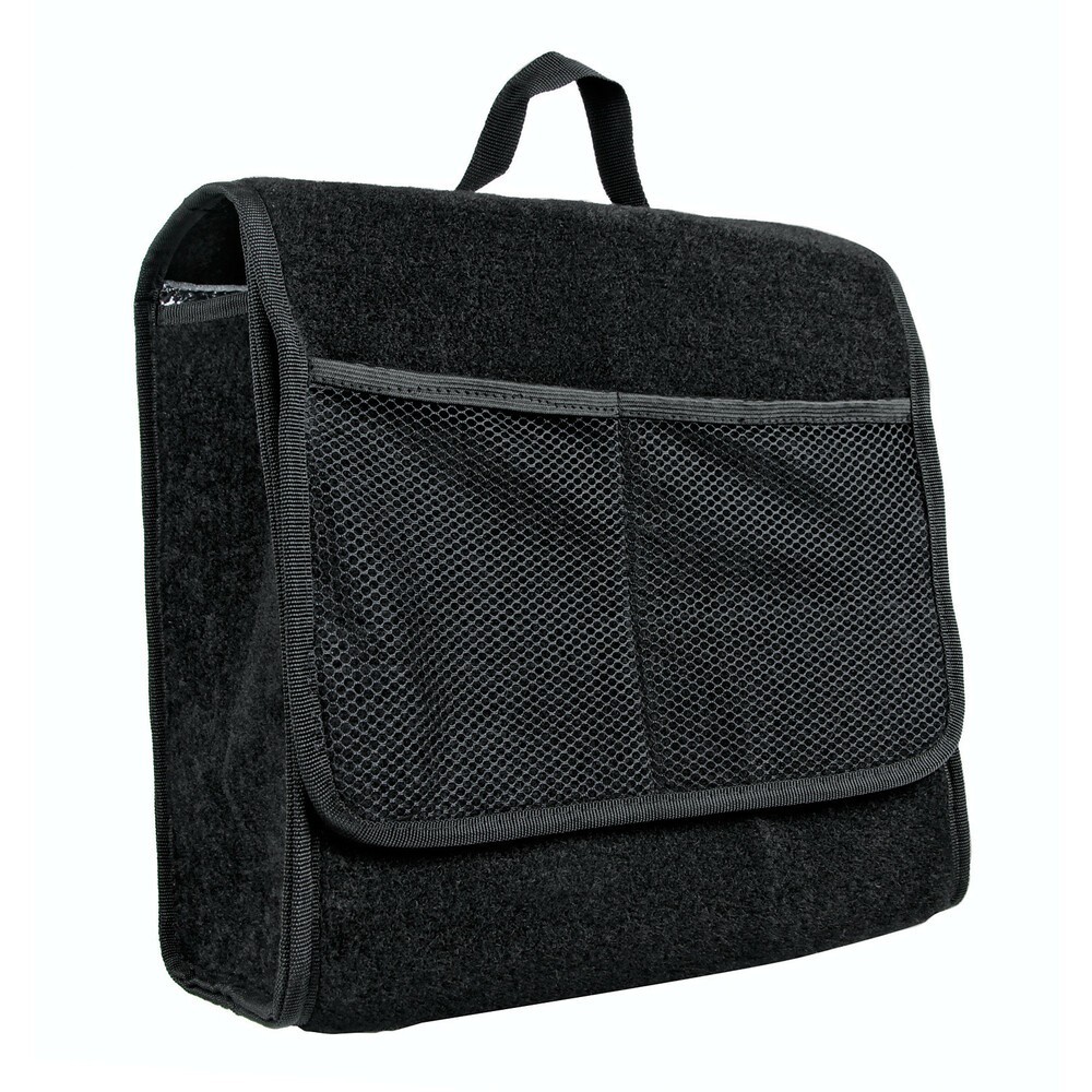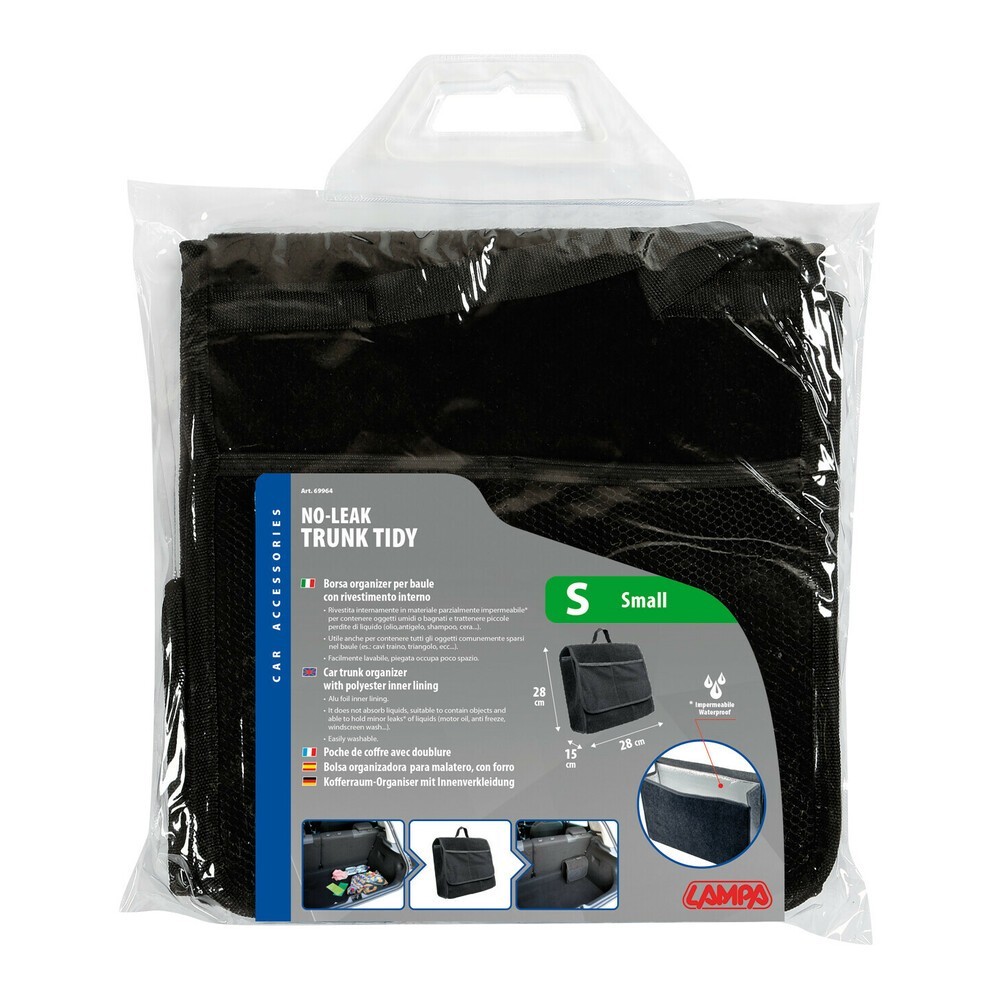 Prodotta in moquette resistente e lavabile. Rivestita internamente in materiale impermeabile. Non assorbe liquidi, parzialmente impermeabile per contenere oggetti umidi o bagnati e trattenere piccole perdite di liquido (olio, antigelo, shampoo, cera...). Utile anche per contenere tutti gli oggetti comunemente sparsi nel baule (cavi traino, triangolo, ecc...). Facilmente lavabile, piegata occupa poco spazio. Con maniglia e chiusura a strappo, fissaggio rapido tramite velcro