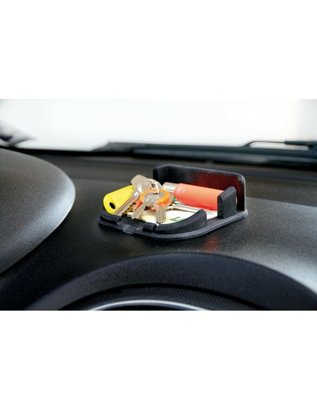 Portatelefono/portaoggetti in silicone. 3 diverse angolazioni di utilizzo (20-45-80 gradi). Si appoggia su qualsiasi cruscotto e rimane fermo in posizione. Con fessura apposita per cavetto di ricarica. Ideale anche per contenere piccoli oggetti. Dimensione: 110x110mm
