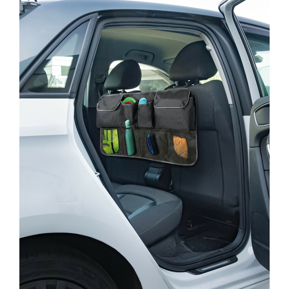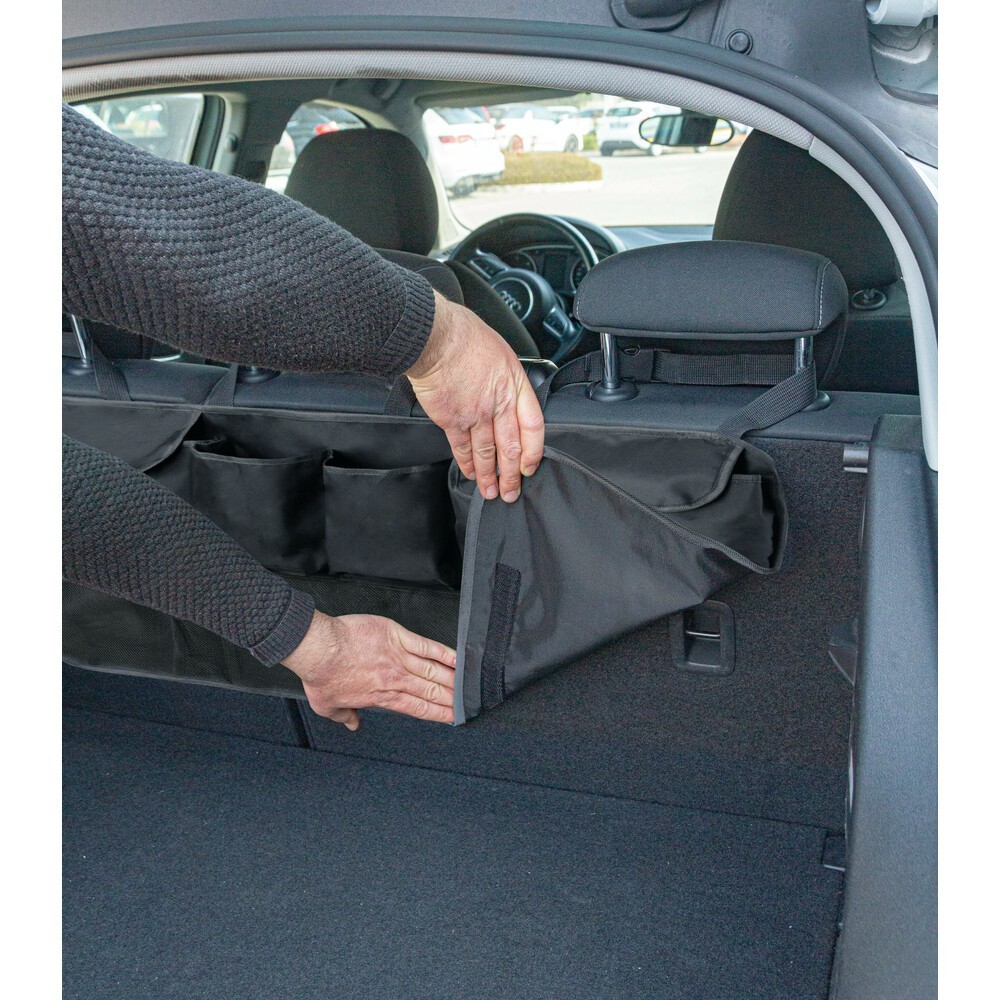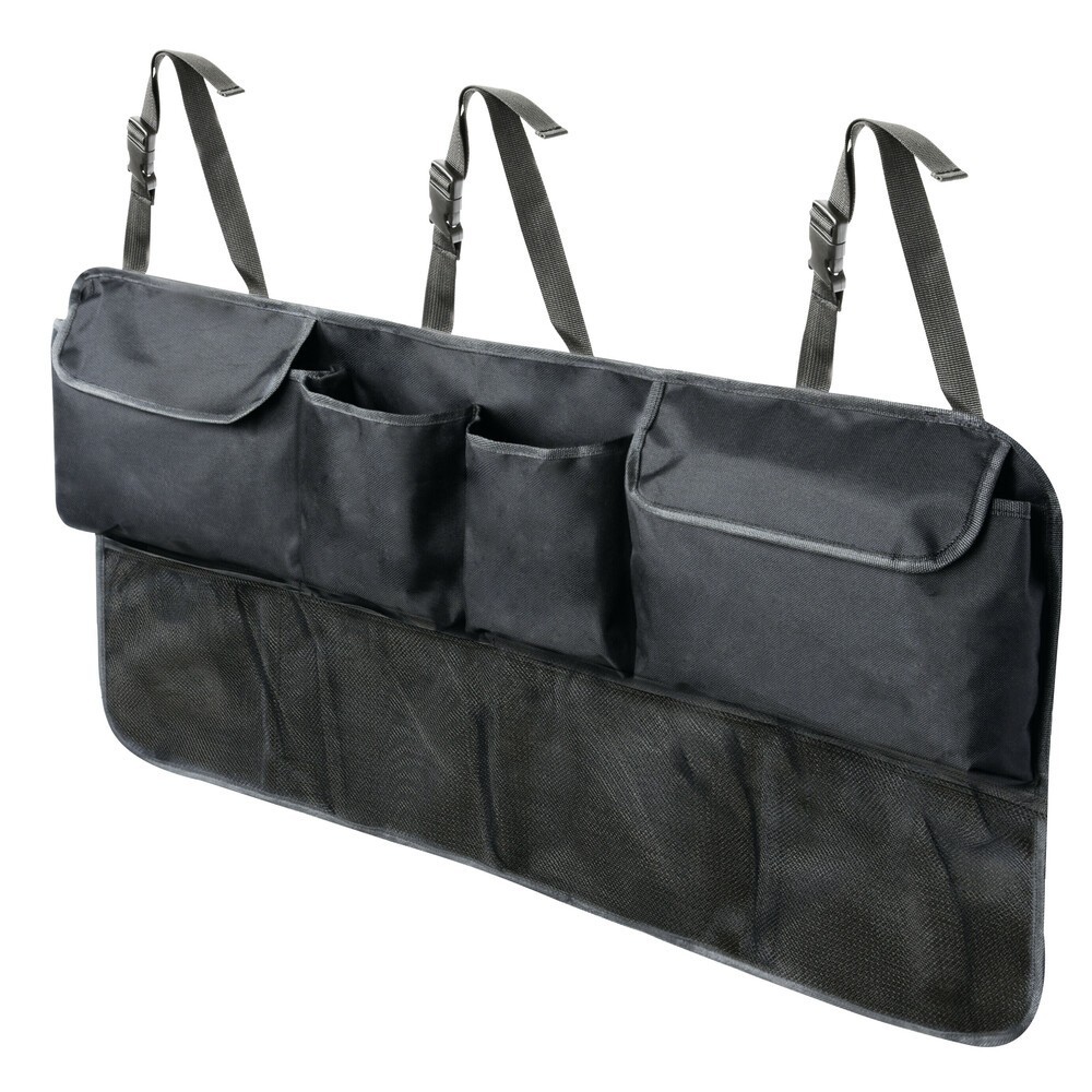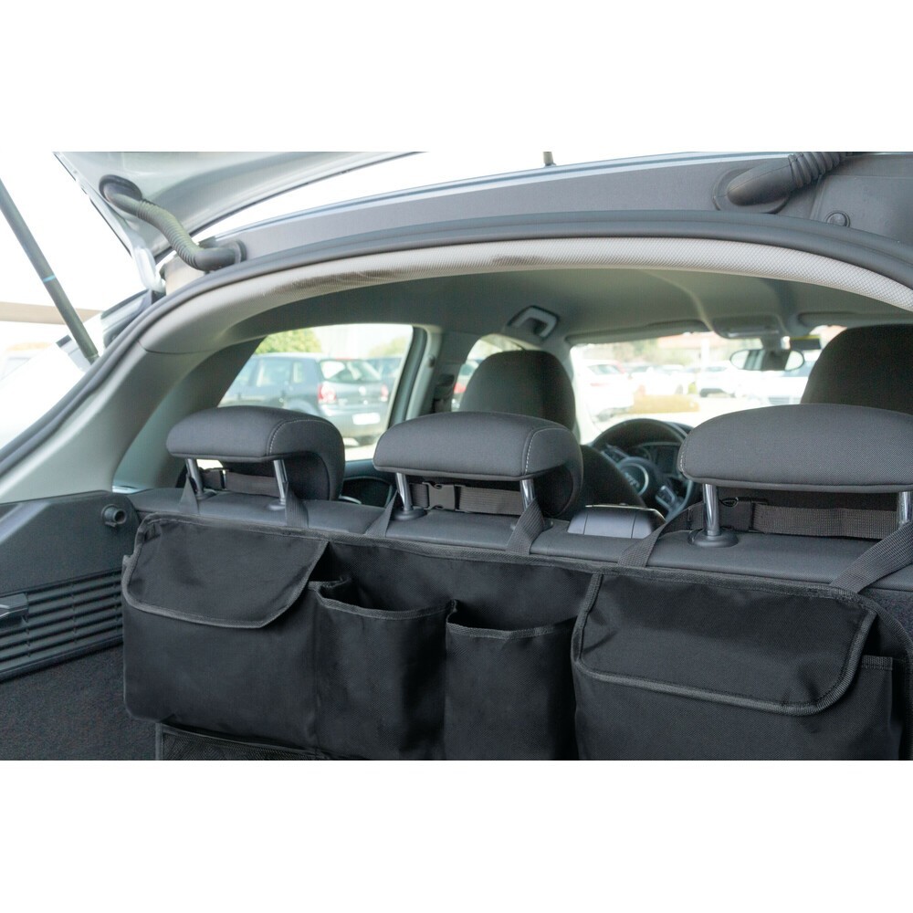 Dotato di 4 capienti tasche e 4 reti per contenere qualsiasi oggetto e avere l'interno dell'auto sempre in ordine. Adatto per montaggio nel baule oppure sul retro dei sedili anteriori / posteriori. Universale e facile da installare su tutte le vetture, si fissa alle aste dei poggiatesta dei sedili tramite i 3 cinghietti regolabili. Se non in uso, ripiegato occupa pochissimo spazio. Dimensione: 88x46cm