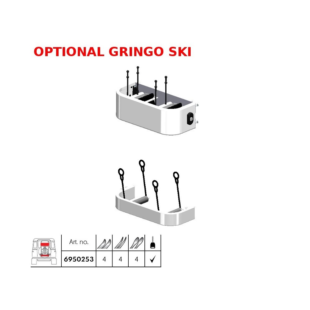 Optional Gringo Ski per sistema di portaggio Gringo per ruota di scorta, trasforma il porta biciclette Gringo bici 6950251 o il porta snowboard/sci Gringo ski & board 6950258 in Porta sci con portaggio 4 sci