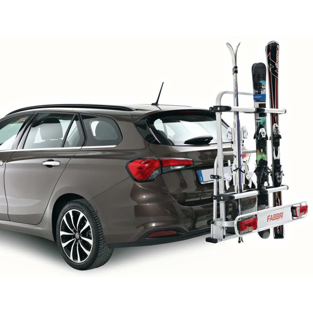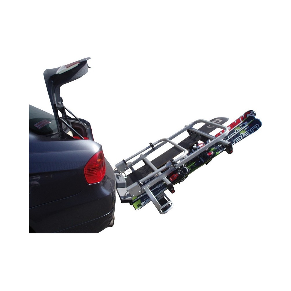 Per 6 paia di sci o per 4 snowboard o per 3 paia di sci e 2 snowboard. Ribaltabile automaticamente grazie al sistema di molle tarate (nessuna forza richiesta) . Richiudibile (quando si viaggia a vuoto) puo' rimanere montato sul gancio traino durante il viaggio e non deve essere riposto nel bagaglio. Approvato TUEV Automotiv. Sistema di chiusura rapida brevettato . Premontato. Anche per ganci in alluminio. Struttura leggera in alluminio. Antifurto (una sola chiave). Dotato di portatarga telescopico. Fanaleria completa orientabile in alluminio. Trasformabile in Portabici con l' Optional venduto a parte.