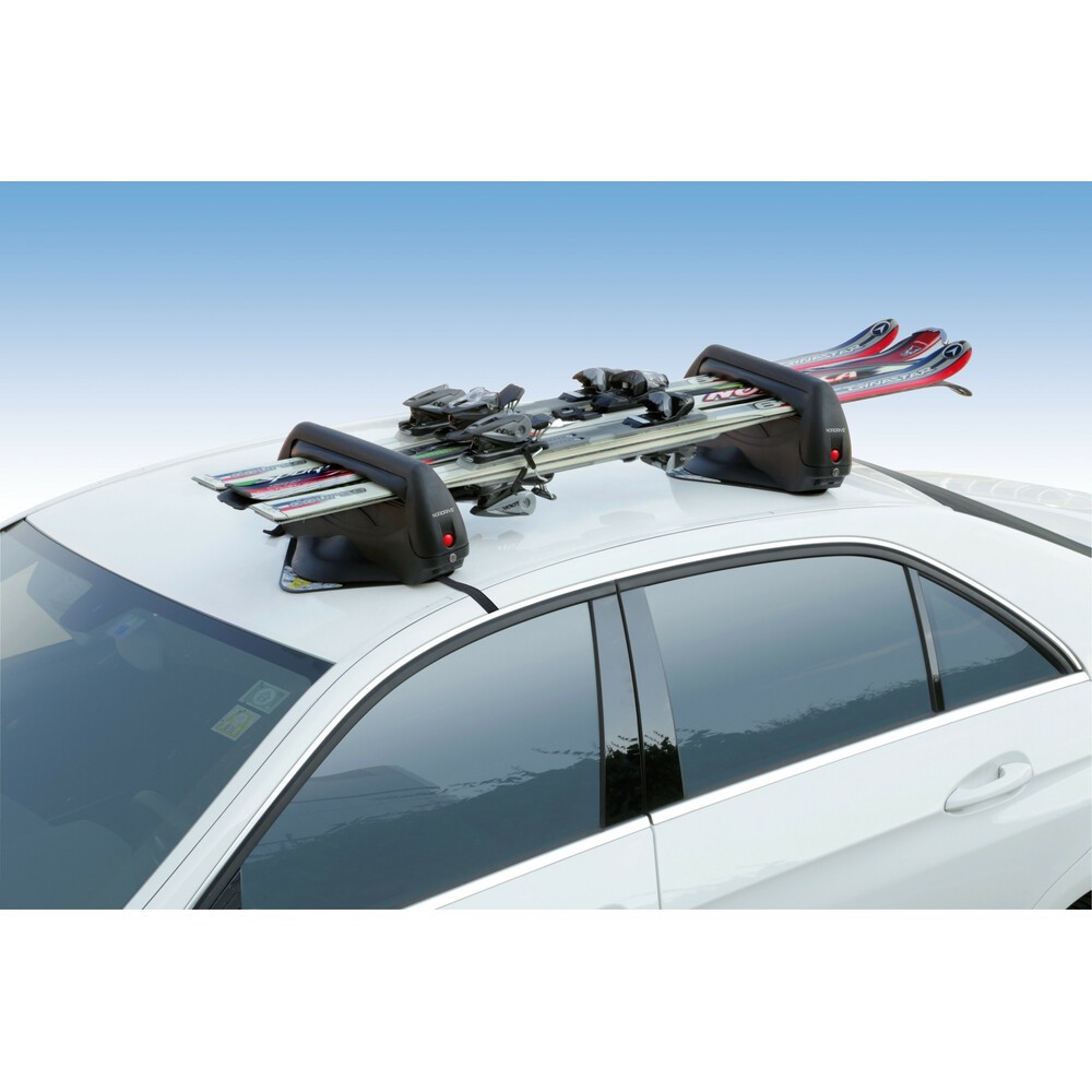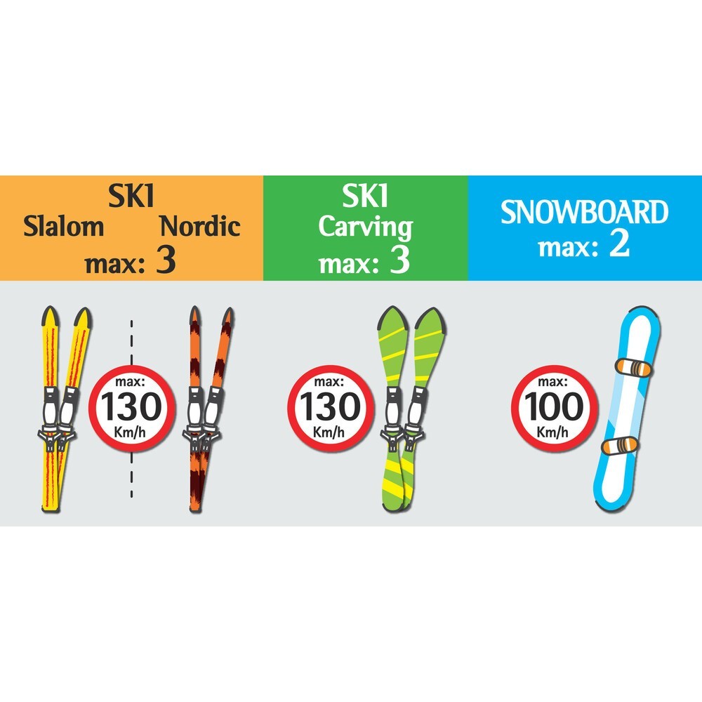 Portasci universale magnetico per max 3 paia di sci normali o carving, oppure per 2 snowboard. Altezza e larghezza utile al carico aumentata per alloggiare comodamente anche 3 coppie di sci tipo Carving. Chiusura antifurto con chiave. Portata max 18 kg