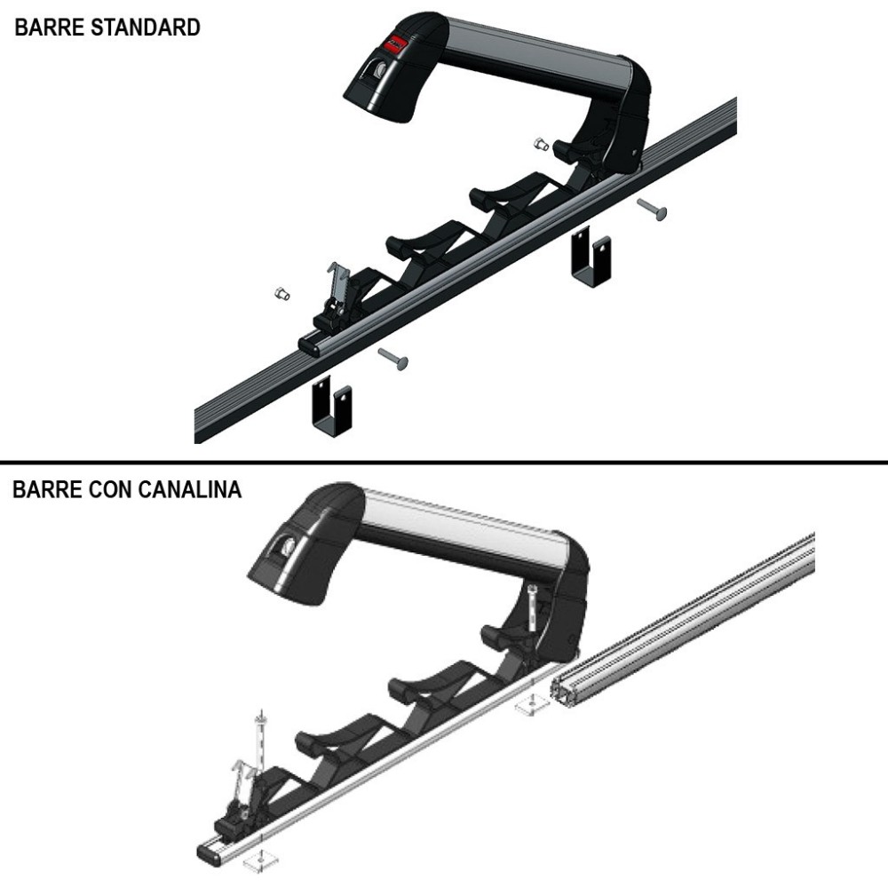 Per barre con canalina o squadrate max larghezza 30 x h 20mm. Porta 4 paia di sci o 2 snow
