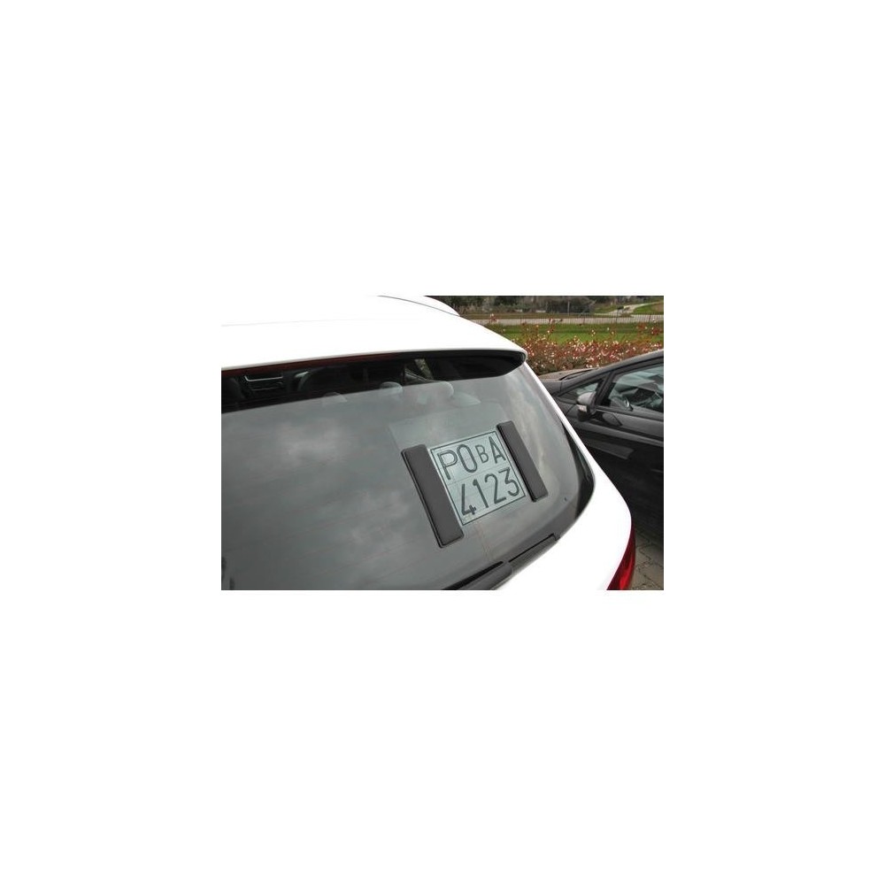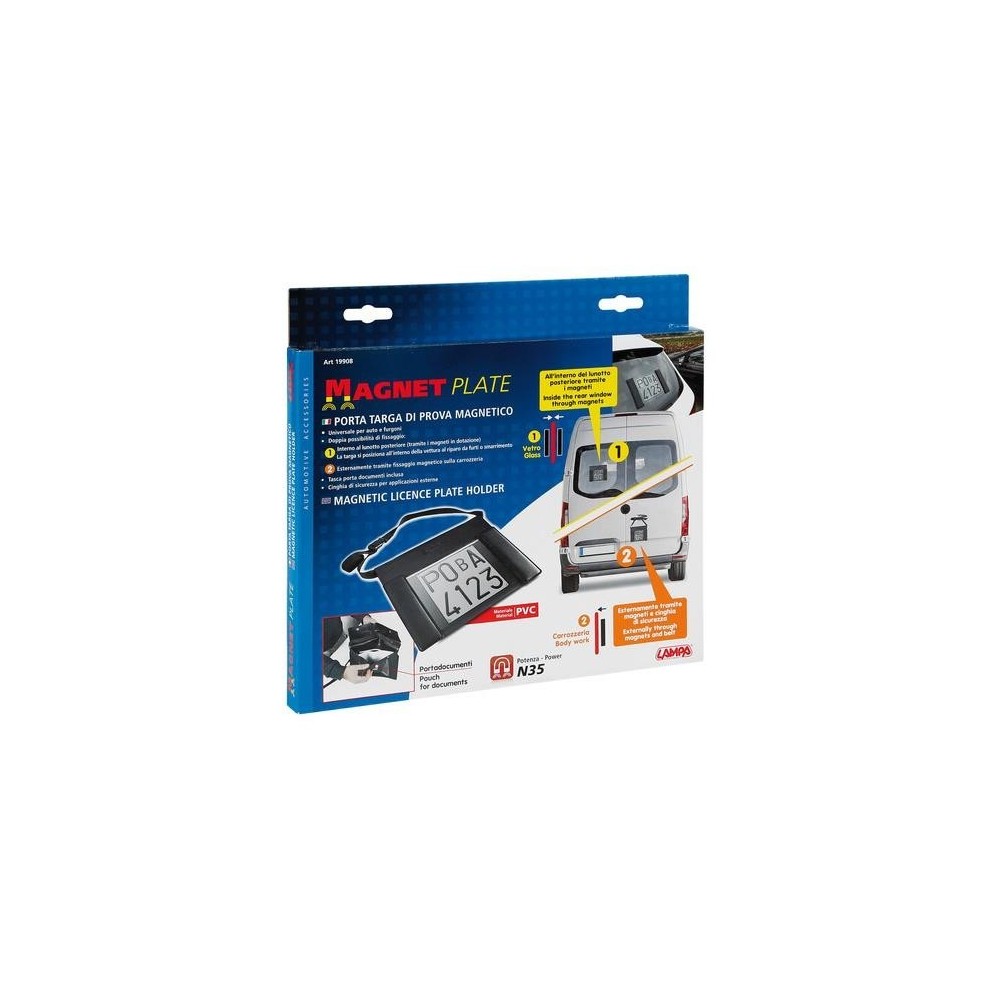 Porta targa di prova universale per auto e furgoni, con tasca porta documenti e cinghia di sicurezza. Doppia possibilita' di fissaggio: 1) All'interno del veicolo, tramite i magneti, sul lunotto posteriore, al riparo da furti o smarrimento. 2) Esternamente tramite fissaggio magnetico (35N) sulla carrozzeria.