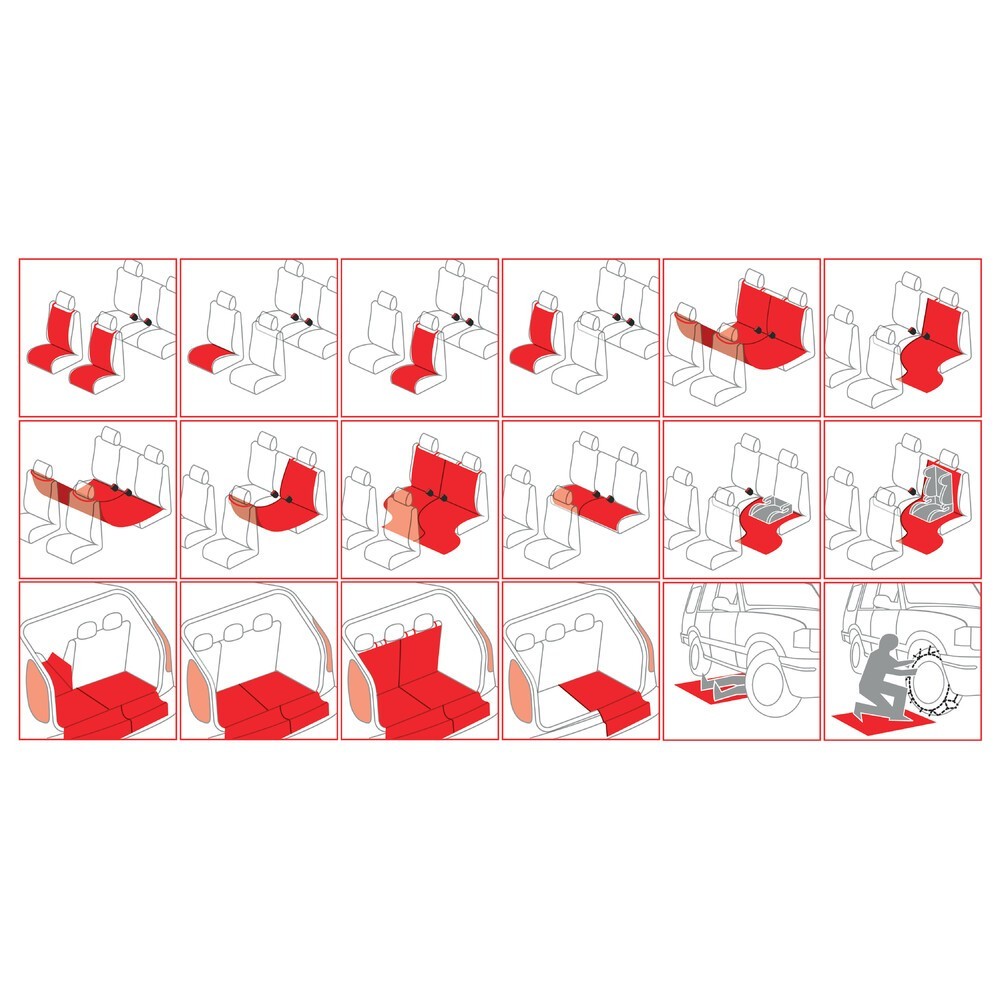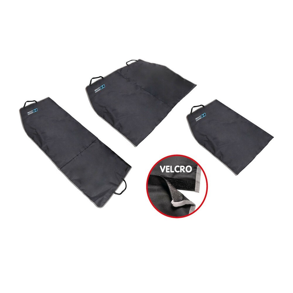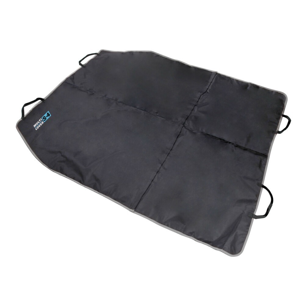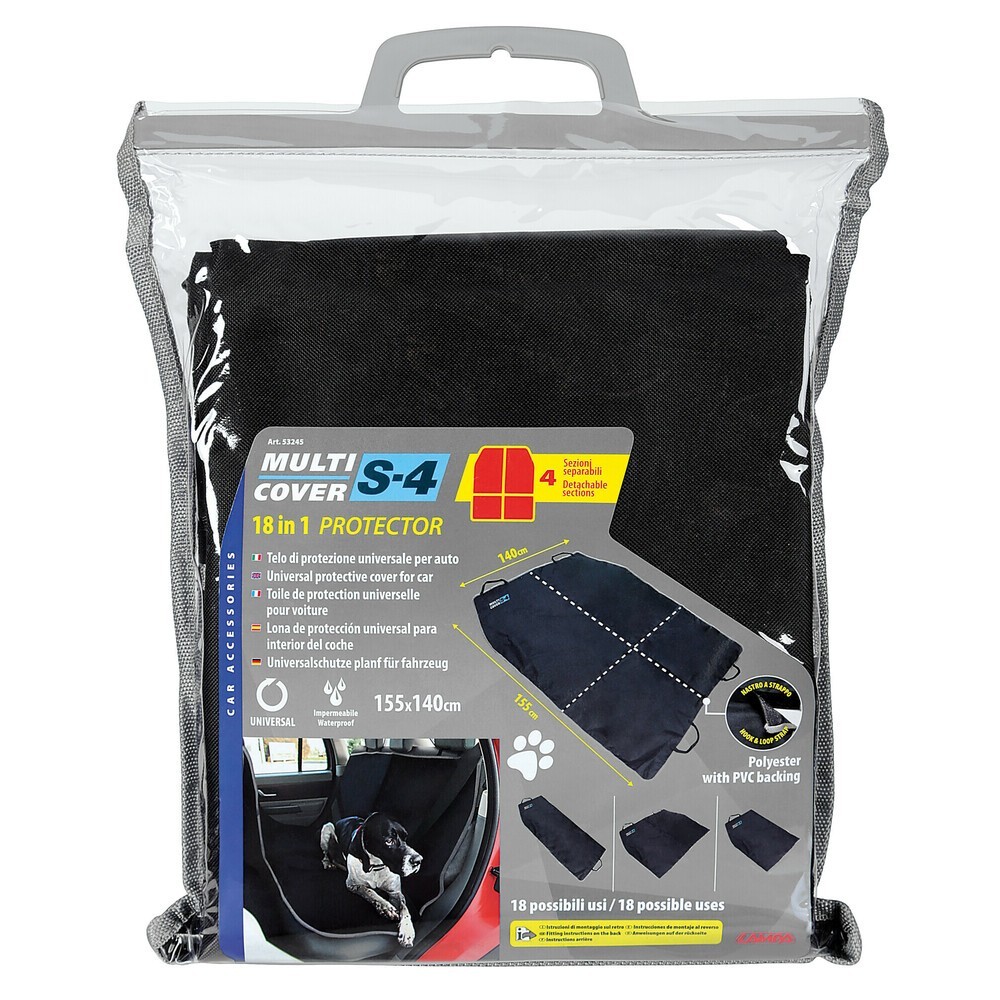 Telo di protezione universale per interno auto. La soluzione ottimale per trasportare animali e oggetti senza rovinare gli interni. Lavabile, 155x140 cm, in robusto poliestere impermeabilizzato con uno strato di PU. Il telo e' divisibile in 2 o 4 sezioni e si conforma a qualsiasi esigenza tramite nastro a strappo. Si posiziona in pochi secondi e si fissa utilizzando le cinghie.