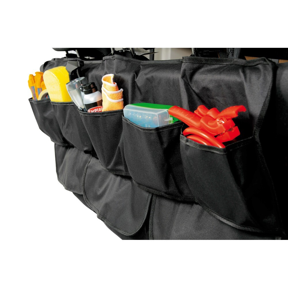 Organizer baule con tappeto di protezione. Baule sempre in ordine, massima funzionalita' ed ottima protezione per il trasporto di merce, animali... 5 tasche aperte + 3 tasche chiuse per contenere una vasta tipologia di oggetti ed evitare lo spostamento e sbattimento durante le curve. Si fissa ai poggiatesta dello schienale posteriore e al pianale del baule. Il tappeto di protezione e' impermeabile e puo' essere fissato all'organizer tramite nastro a strappo per formare un unico rivestimento del baule oppure usato separatamente. Base con nastri a strappo per il fissaggio al veicolo. Impermeabile in poliestere 420D + PVC. Dimensione: 110x155cm