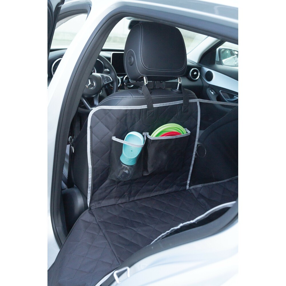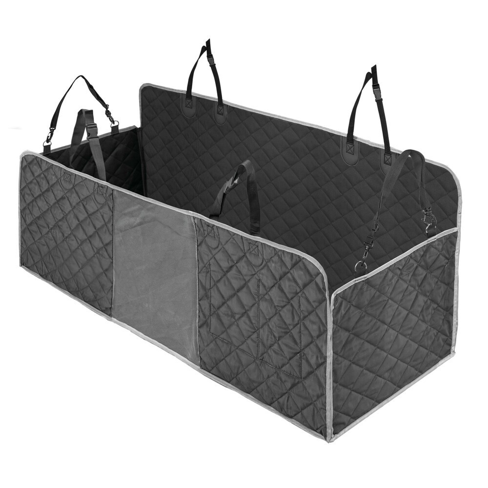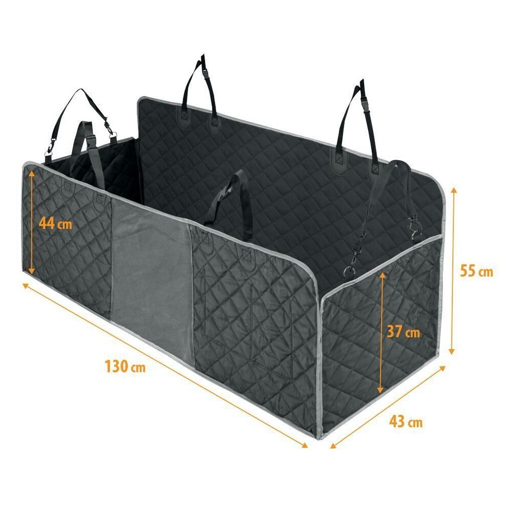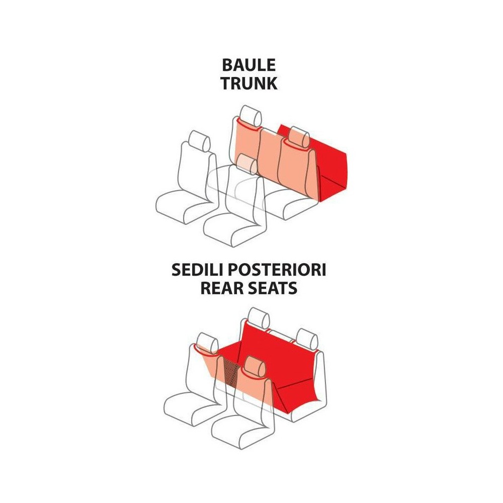 Protezione totale dei sedili e degli interni dell'auto su tutti e 4 i lati. Si fissa ai poggiatesta anteriori e posteriori e, lateralmente, alle maniglie per creare una vera e propria cuccia da viaggio. Tutte le fibbie sono regolabili per un montaggio perfetto sui diversi modelli di auto (berline, SUV, SW, utilitarie). L'ampia rete anteriore posizionata nel centro tra i sedili consente una corretta areazione e mantiene una visuale costante tra animale e passeggeri anteriori.nDue aperture con nastro a strappo consentono il passaggio delle cinture di sicurezza e permettono l'aggancio della cintura per il cane. Due tasche per contenere snack, ciotole o altri oggetti ed avere cosi l'auto sempre in ordine. Le protezioni laterali sono dotate di cerniere per far salire e scendere l'animale più facilmente. Le protezioni laterali proteggono i pannelli delle porte da graffi e morsi. Tessuto 100% poliestere 600D, super resistente, impermeabile, anti-graffio. Lo speciale tessuto protegge i sedili da ogni tipo di sporco e può essere aspirato, lavato e spazzolato senza subire danni. Versatile, si può utilizzare anche solo per proteggere i sedili o il bagagliaio. Dimensione: 200x140cm