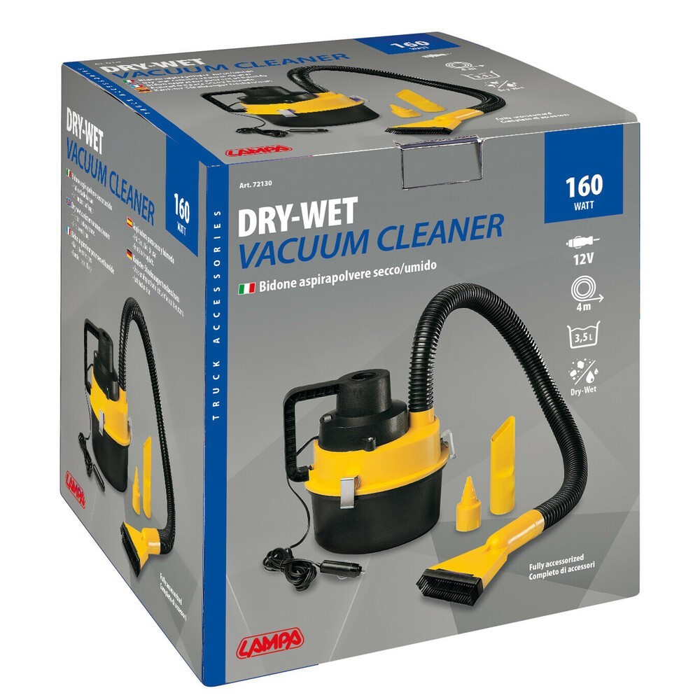 In dotazione tubo flessibile da 100 cm per raggiungere facilmente anche le zone più difficili, bocchettone aspirazione con spazzola asportabile, taccordo adattatore per gonfiaggio materassini, beccuccio diagonale stretto per raggiungere angoli e fessure. Serbatoio di contenimento da circa 3,5 litri con spinotto per presa accendisigari con cavo da 4 metri. Alimentazione 12V - Potenza 160W.