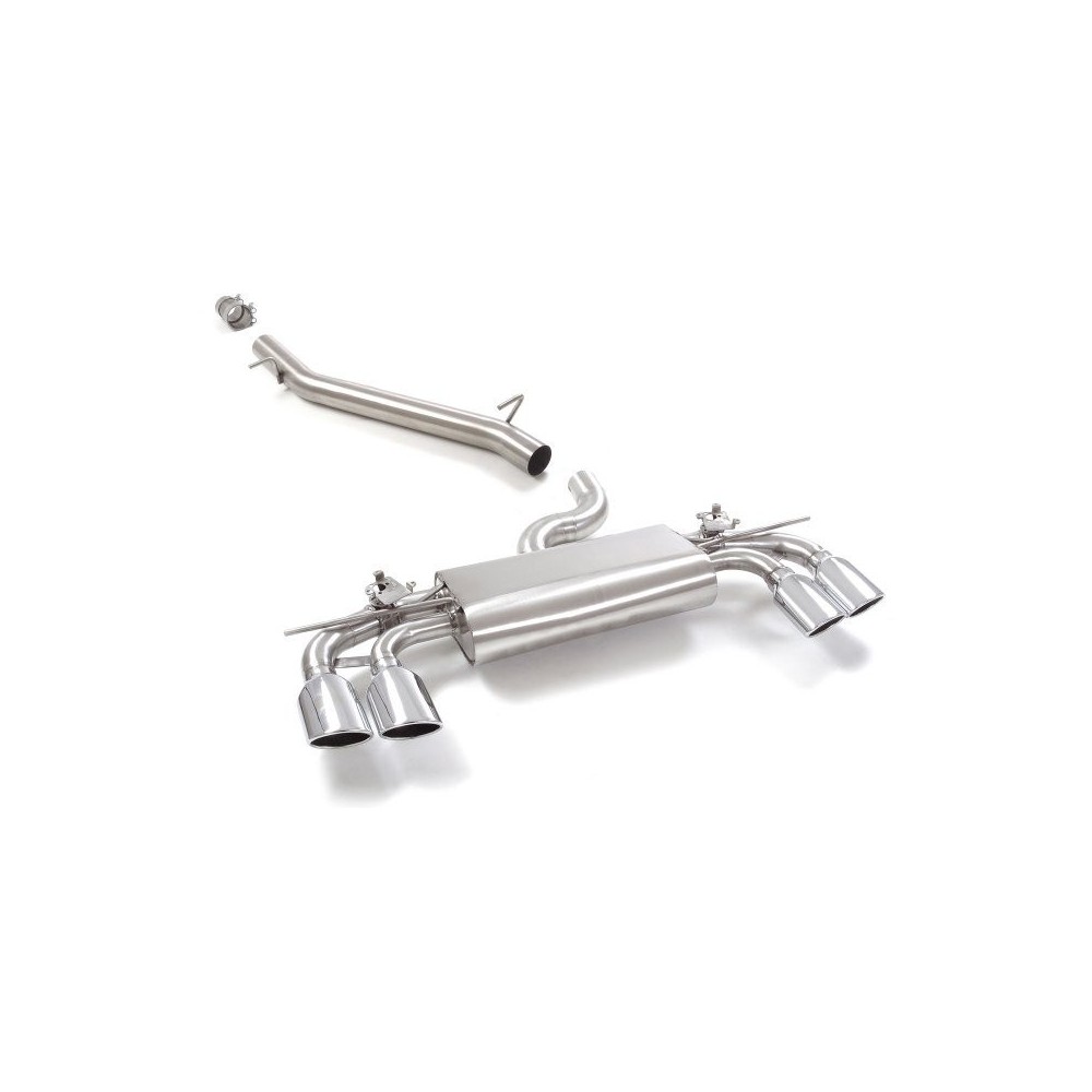 Tubo centrale senza silenziatore inox + Posteriore inox sdoppiato con terminali ovali 4x 108x70 mm con valvole integrate. Il controllo della valvola avviene tramite il motorino della valvola originale. Entrata diametro esterno 76mm con riduzione diametro interno 65mm. Diametro esterno tubo: 76mm. Applicazione: Volkswagen T-Roc (A1) R 2.0 TSI 4motion 221kw dal 2019