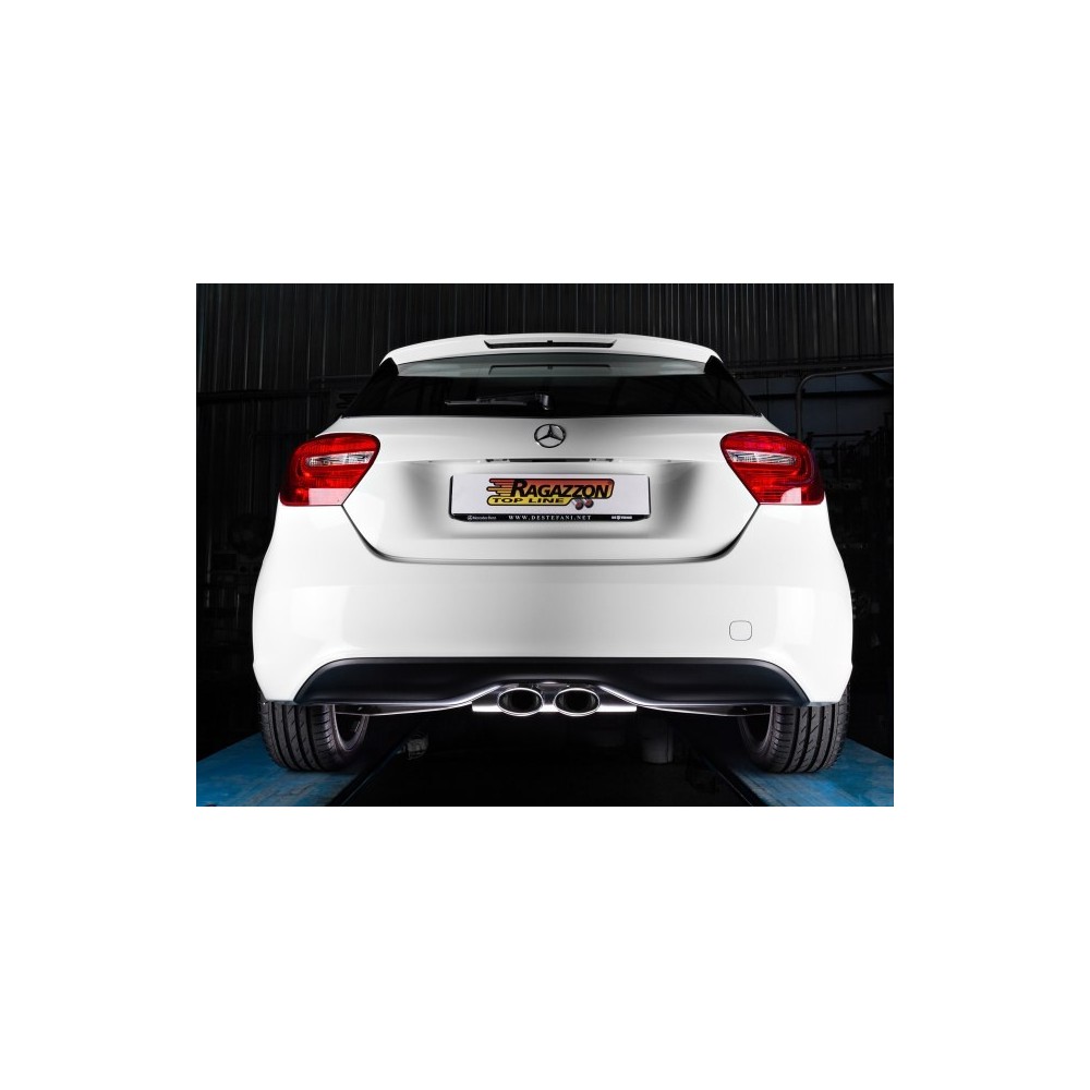Posteriore inox omologato marca RAGAZZON con terminali ovali centrali 2 / 115x70 mm. Montaggio con taglio ed innesto - Riduzione per montaggio su centrale originale inclusa nel kit.Paraurti Allestimento ''Executive'' , altrimenti necessita modifica paraurti originale. Caratteristiche: entrata diametro interno 60mm con riduzione 55mm. diametro esterno tubo 60mm. Compatibilita': Mercedes Classe A (W176) - A180CDI (1461cc - 80Kw) 2012>> A180 (90kW) 2012>> - A200 (115kW) 2012>>