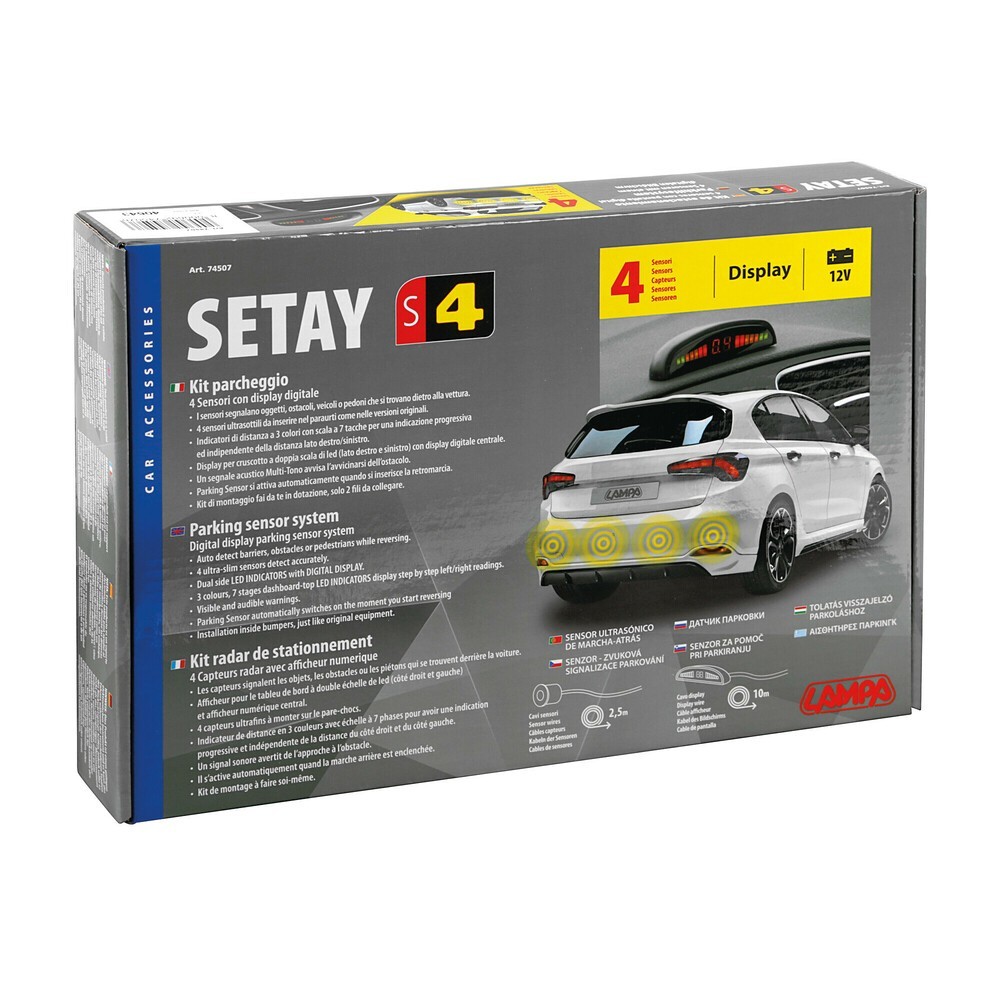 Setay S4, kit 4 sensori parcheggio con display digitale, 12V. I sensori segnalano oggetti, ostacoli, veicoli o pedoni che si trovano dietro alla vettura. 4 sensori ultrasottili da inserire nel paraurti come nelle versioni originali. Indicatori di distanza a 3 colori con scala a 7 tacche per una indicazione progressiva ed indipendente della distanza lato destro/sinistro. Display per cruscotto a doppia scala di led (lato destro e sinistro) con display digitale centrale. Un segnale acustico multi-mono avvisa l'avvicinarsi dell'ostacolo. Parking Sensor si attiva automaticamente quando si inserisce la retromarcia. Kit di montaggio fai da te in dotazione, solo 2 fili da collegare. Cavo sensori posteriori 2,5 m - Cavo display 10 m
