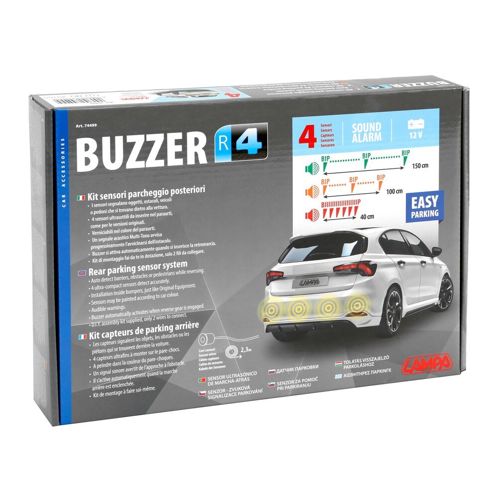 kit 4 sensori parcheggio posteriori, 12V. I sensori segnalano oggetti, ostacoli, veicoli o pedoni che si trovano davanti alla vettura. 4 sensori ultrasottili da inserire nel paraurti, come per le versioni originali. Verniciabili nello stesso colore del paraurti. Un segnale acustico multi-tono avvisa progressivamente l'avvicinarsi dell'ostacolo. Il Buzzer si attiva automaticamente quando si inserisce la retromarcia. Kit di montaggio fai da te in dotazione, solo 2 fili da collegare. Cavo sensori posteriori 2,3 m