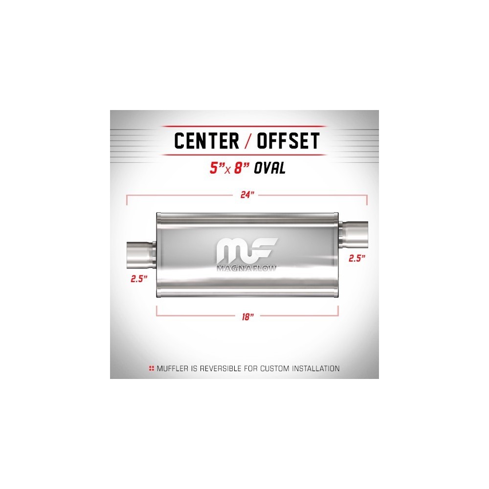 I Silenziatori MagnaFlow Performance sono in acciaio inox 100% e saldati con giunture a giro per una solida e robusta affidabilita' anche nelle condizioni piu' estreme. Sono caratterizzati da un flusso libero, che scorre dritto attraverso un nucleo perforato in acciaio inossidabile, avvolti in rete metallica e riempiti con fibra acustica per ottenere quel liscio, profondo tono. I Silenziatori sono incapsulati con materiale fonoassorbente per garantirne una lunga durata senza degradazione del suono. INFO TECNICHE: Silenziatore ovale 5''x8'' (12.7x20.32cm) - Lunghezza totale: 24'' (60.96cm) - Lunghezza silenziatore: 18'' (45.72cm) - Uscite: 2.5'' e 2.5'' (6.4 e 6.4cm) - Posizione: Center/Offset