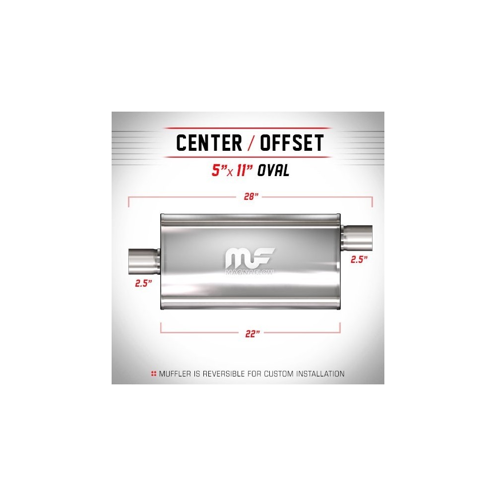 I Silenziatori MagnaFlow Performance sono in acciaio inox 100% e saldati con giunture a giro per una solida e robusta affidabilita' anche nelle condizioni piu' estreme. Sono caratterizzati da un flusso libero, che scorre dritto attraverso un nucleo perforato in acciaio inossidabile, avvolti in rete metallica e riempiti con fibra acustica per ottenere quel liscio, profondo tono. I Silenziatori sono incapsulati con materiale fonoassorbente per garantirne una lunga durata senza degradazione del suono. INFO TECNICHE: Silenziatore ovale 5''x11'' (12.7x27.94cm) - Lunghezza totale: 28'' (71.12cm) - Lunghezza silenziatore: 22'' (55.88cm) - Uscite: 2.5'' e 2.5'' (6.4 e 6.4cm) - Posizione: Center/Offset