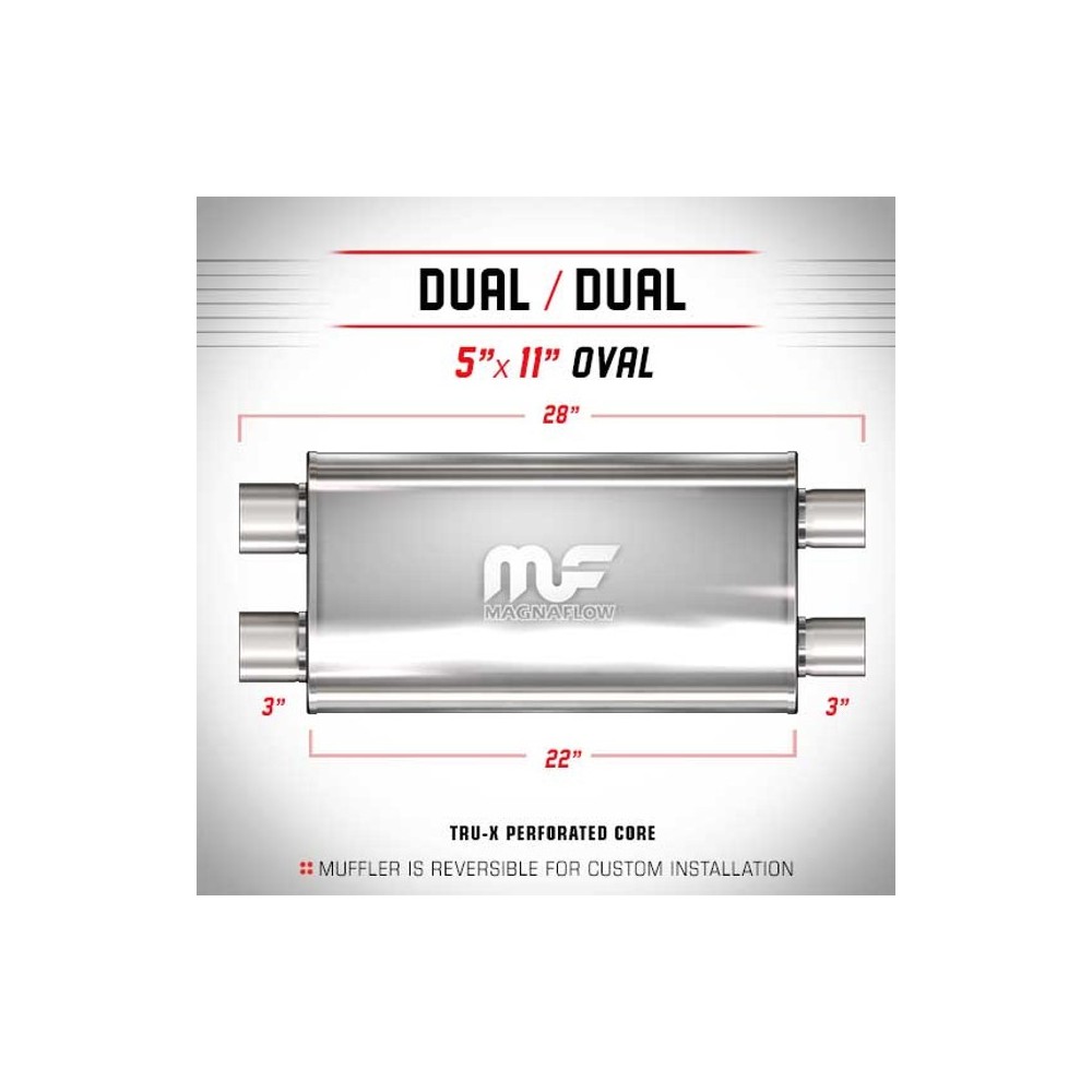 I Silenziatori MagnaFlow Performance sono in acciaio inox 100% e saldati con giunture a giro per una solida e robusta affidabilita' anche nelle condizioni piu' estreme. Sono caratterizzati da un flusso libero, che scorre dritto attraverso un nucleo perforato in acciaio inossidabile, avvolti in rete metallica e riempiti con fibra acustica per ottenere quel liscio, profondo tono. I Silenziatori sono incapsulati con materiale fonoassorbente per garantirne una lunga durata senza degradazione del suono. INFO TECNICHE: Silenziatore ovale 5''x11'' (12.7x27.94cm) - Lunghezza totale: 28'' (71.12cm) - Lunghezza silenziatore: 22'' (55.88cm) - Uscite: 3'' e 3'' (7.62 e 7.62cm) - Posizione: Dual/Dual